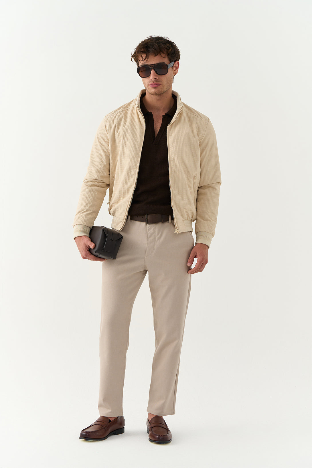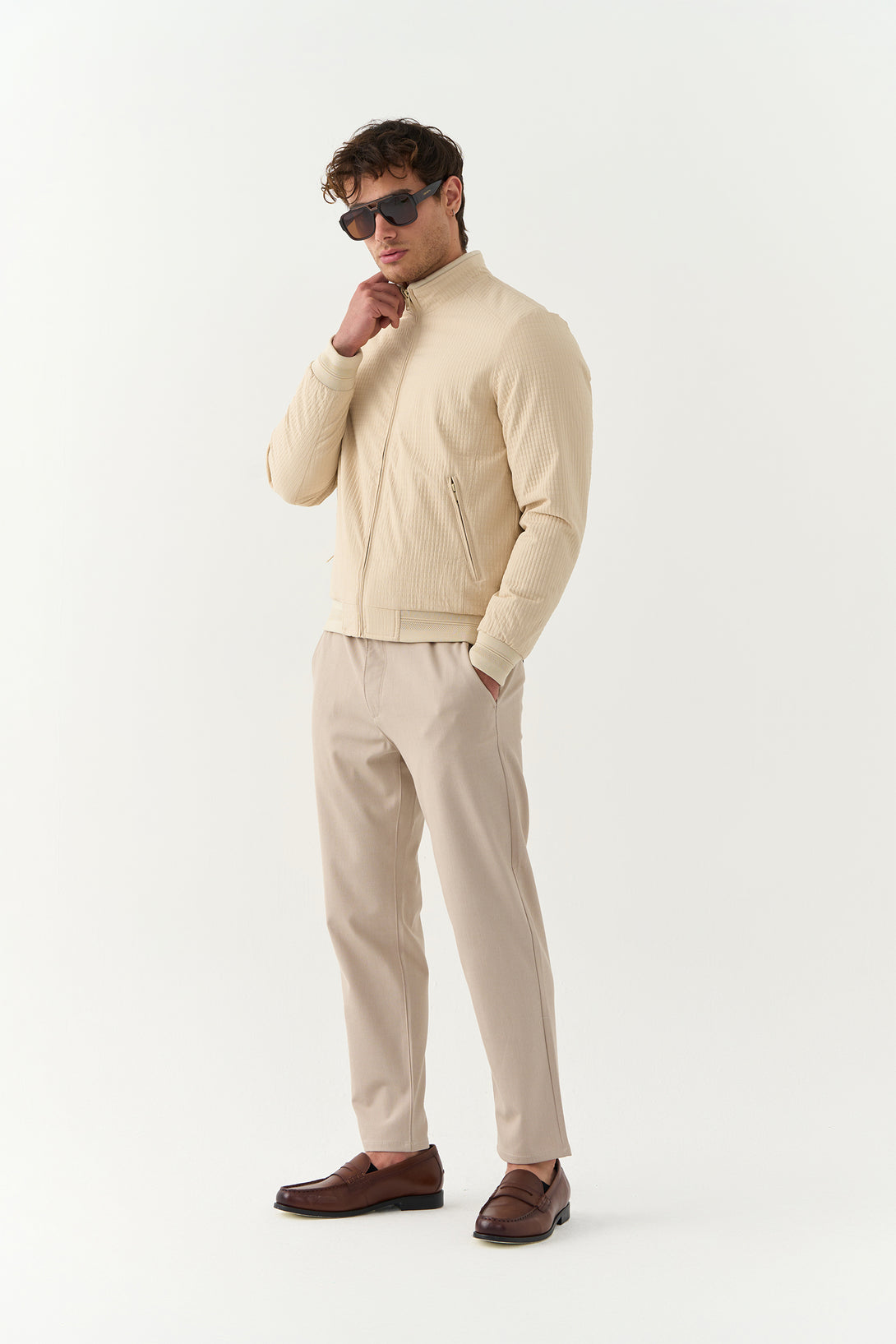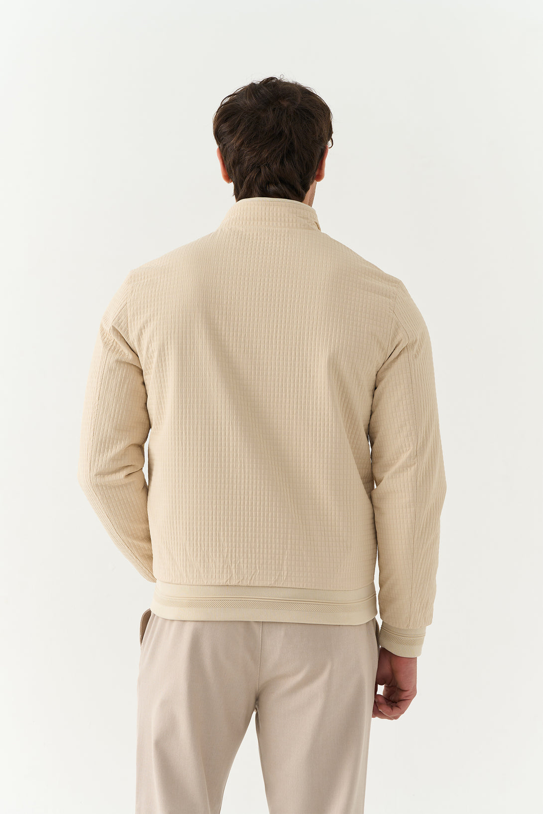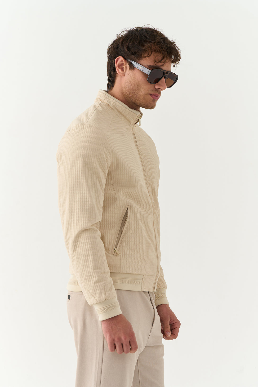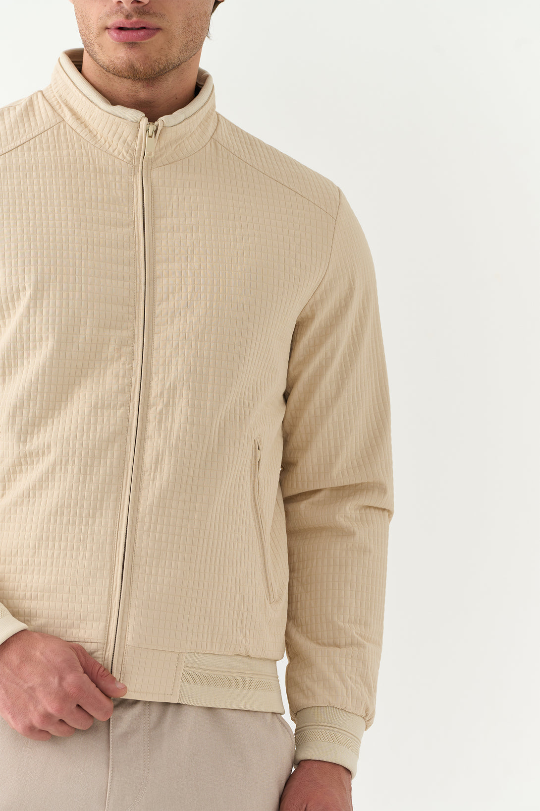 Features: Unique block texture, soft-touch fabric, clean off-white tone, secure zipper front, ribbed detailing.
