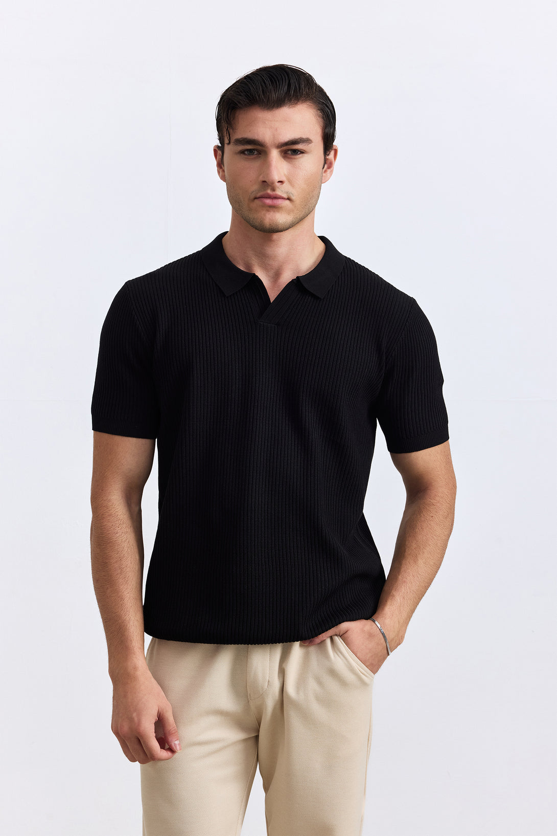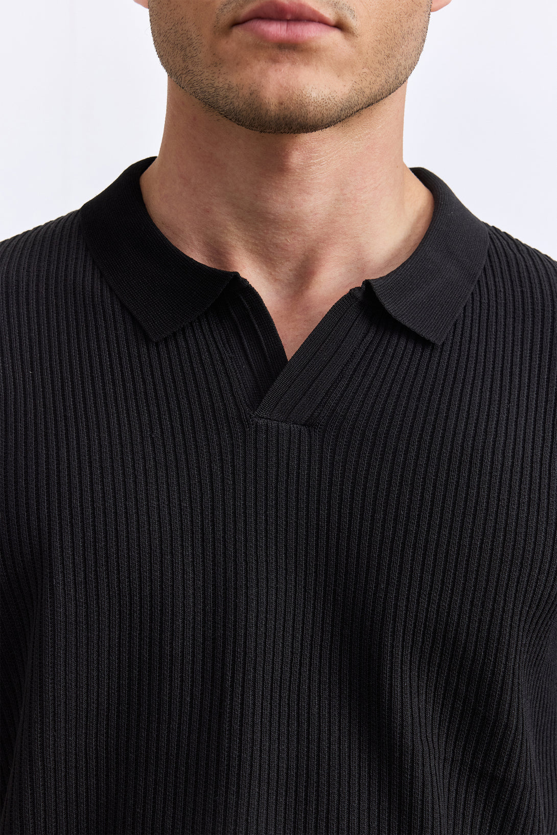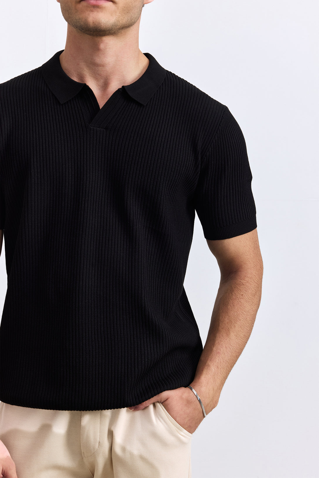 Sleek black polo with a modern Johnny collar, crafted in premium knit.
