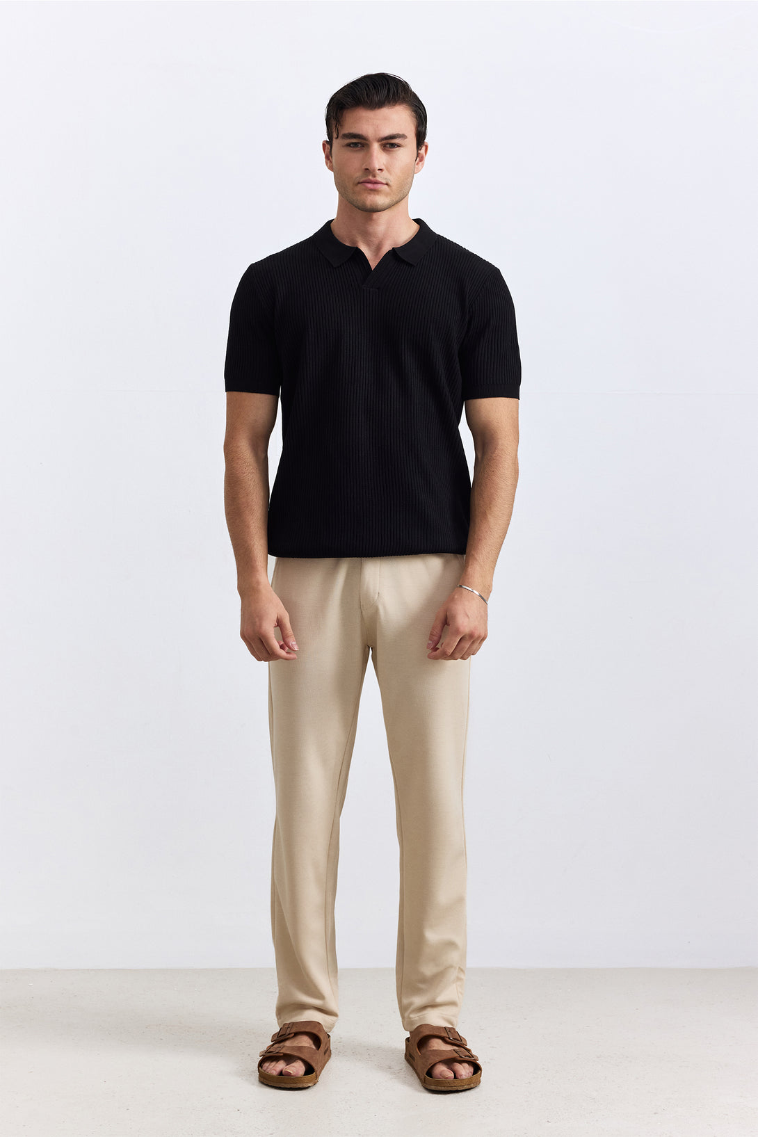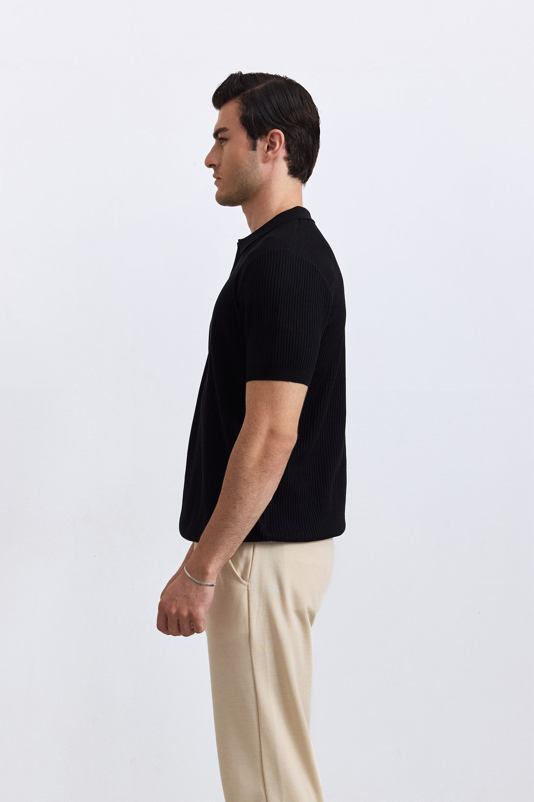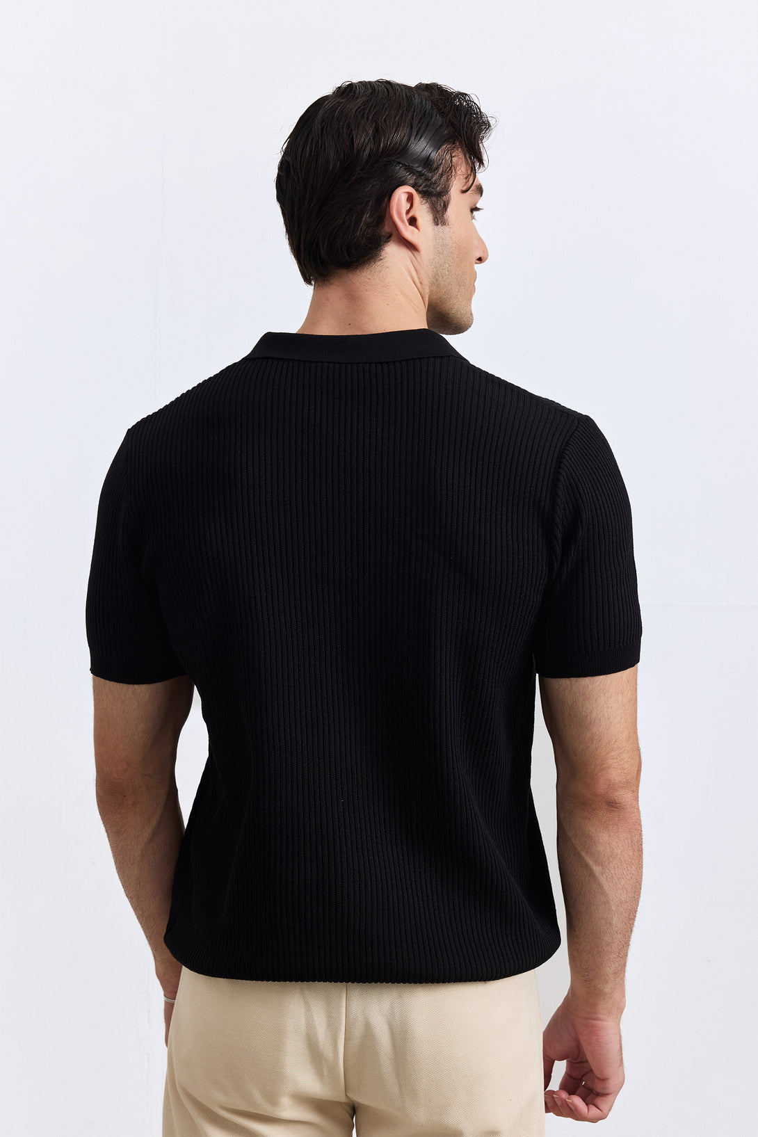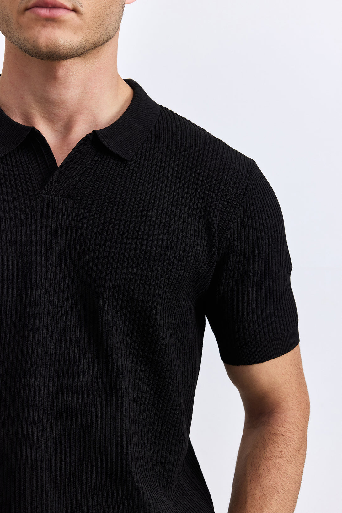 Sleek black polo with a modern Johnny collar, crafted in premium knit.