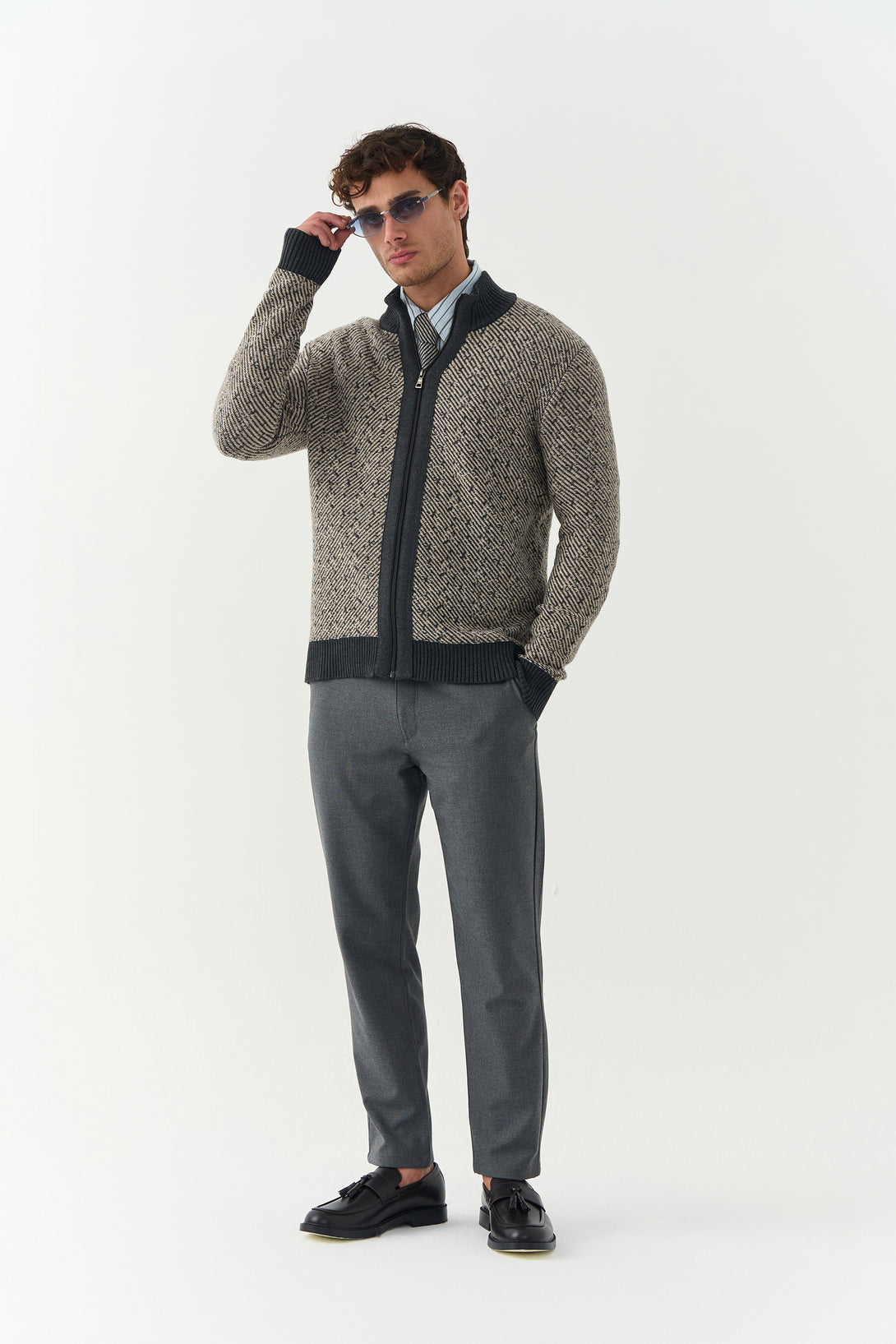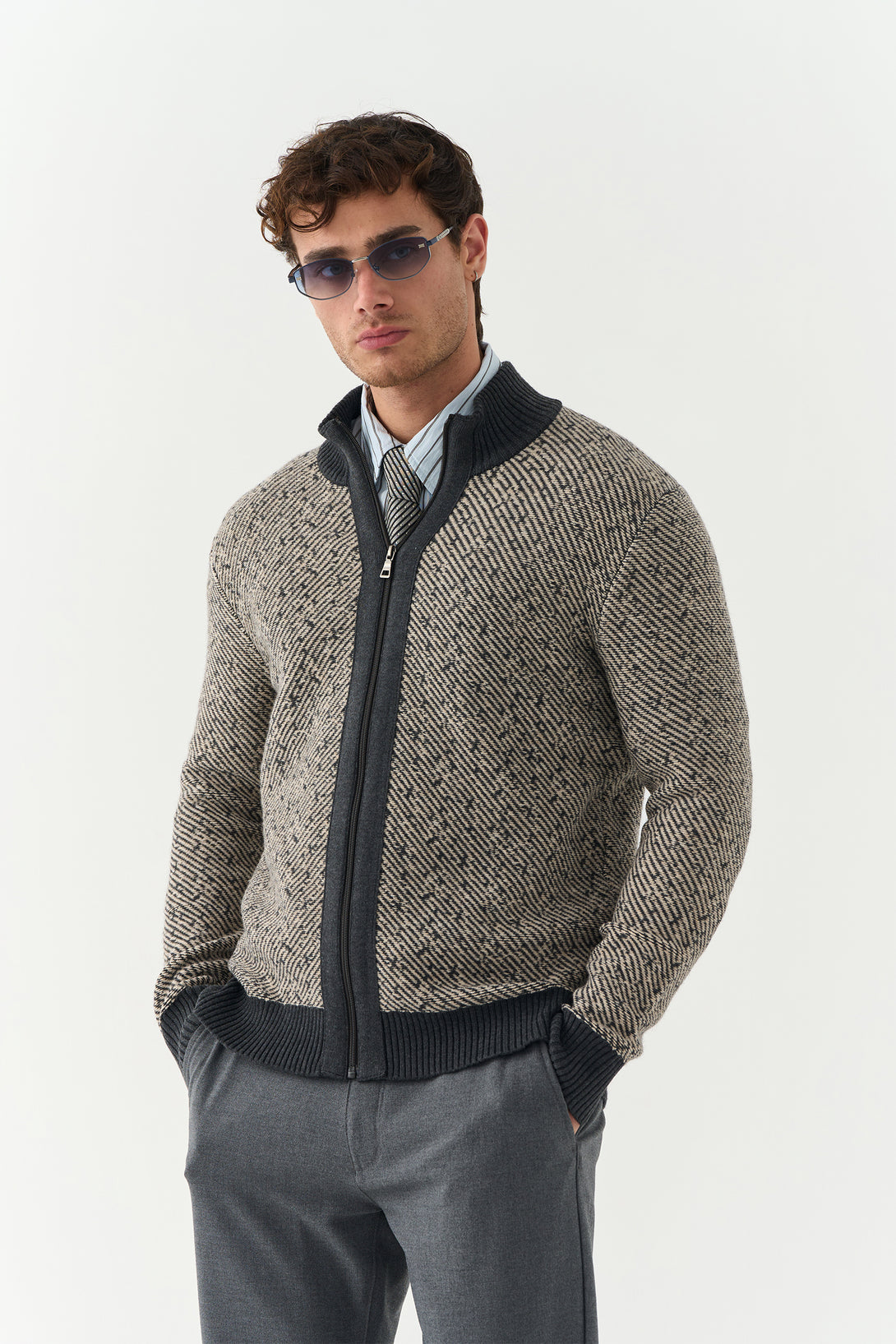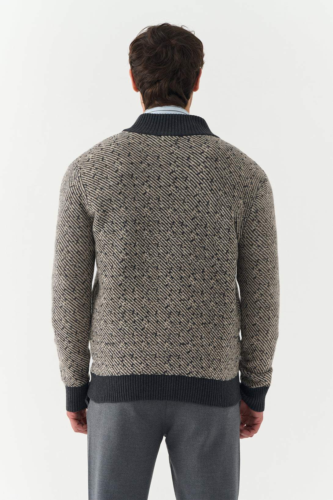 A clean and versatile essential, this Grey Knitted Woollen Zipper offers both warmth and modern minimalism. Perfect for layering over shirts or tees.