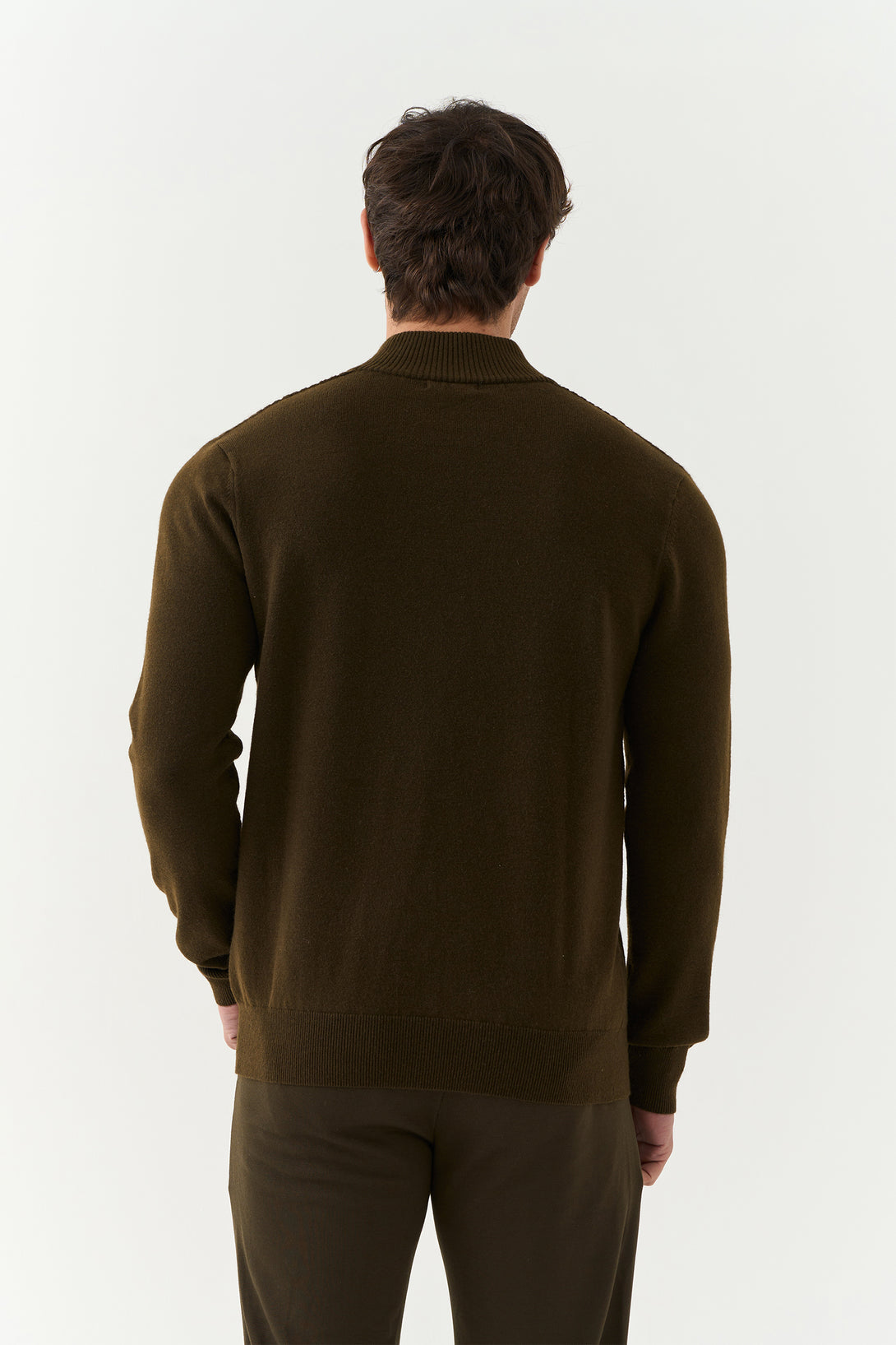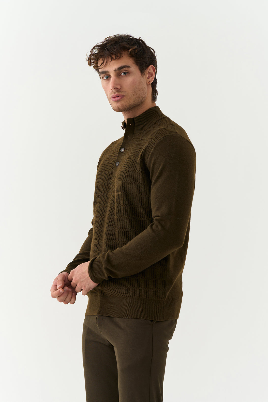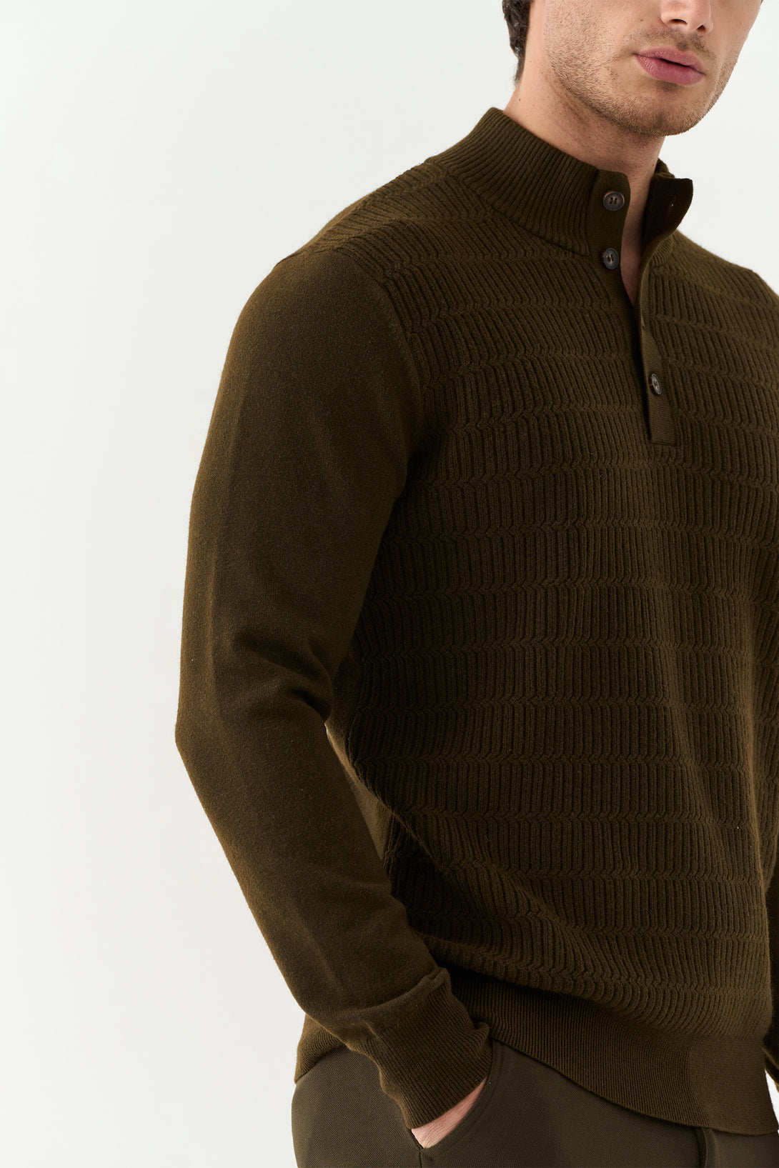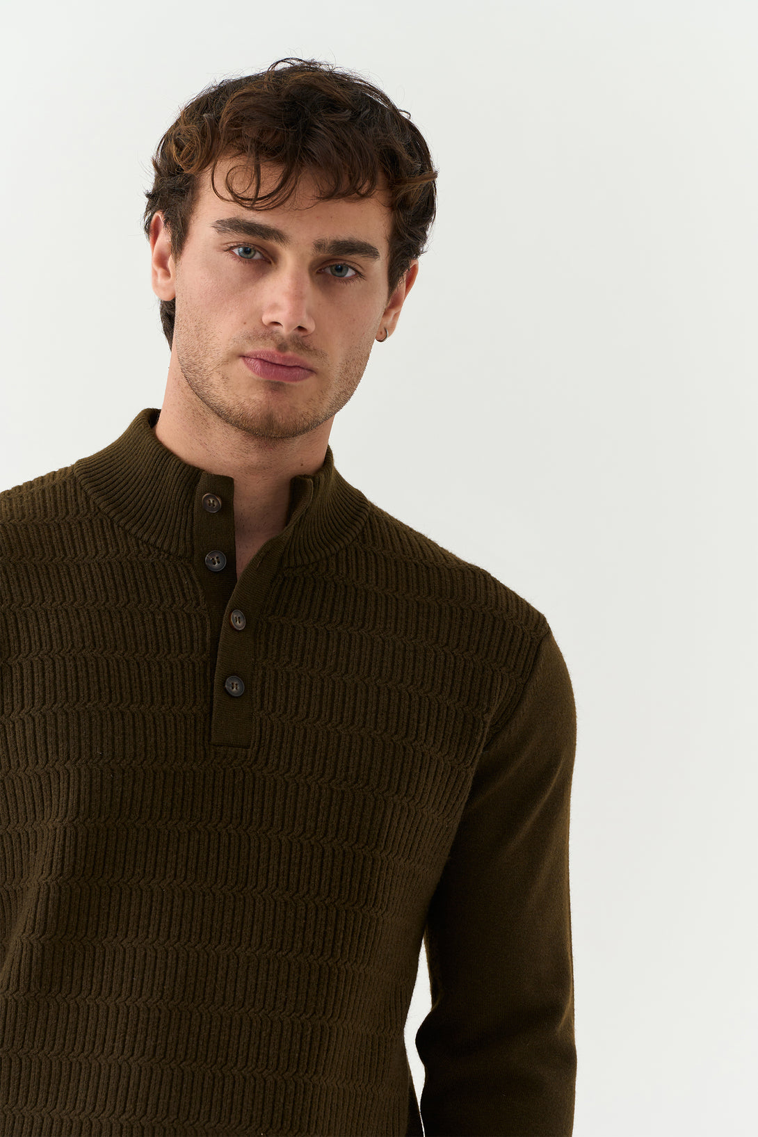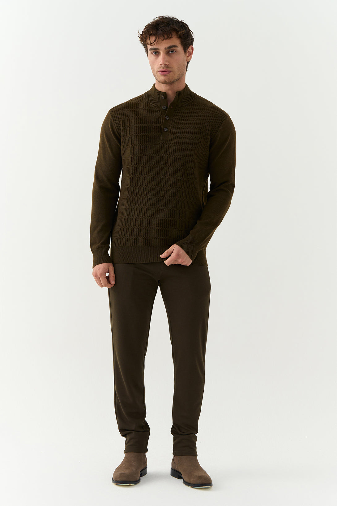 Comfortable, warm, and stylish—this Olive Brown Henley Sweater is ideal for smart-casual layering.