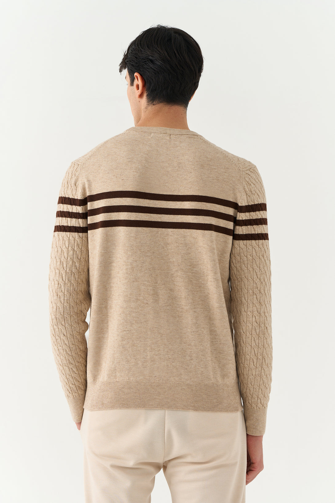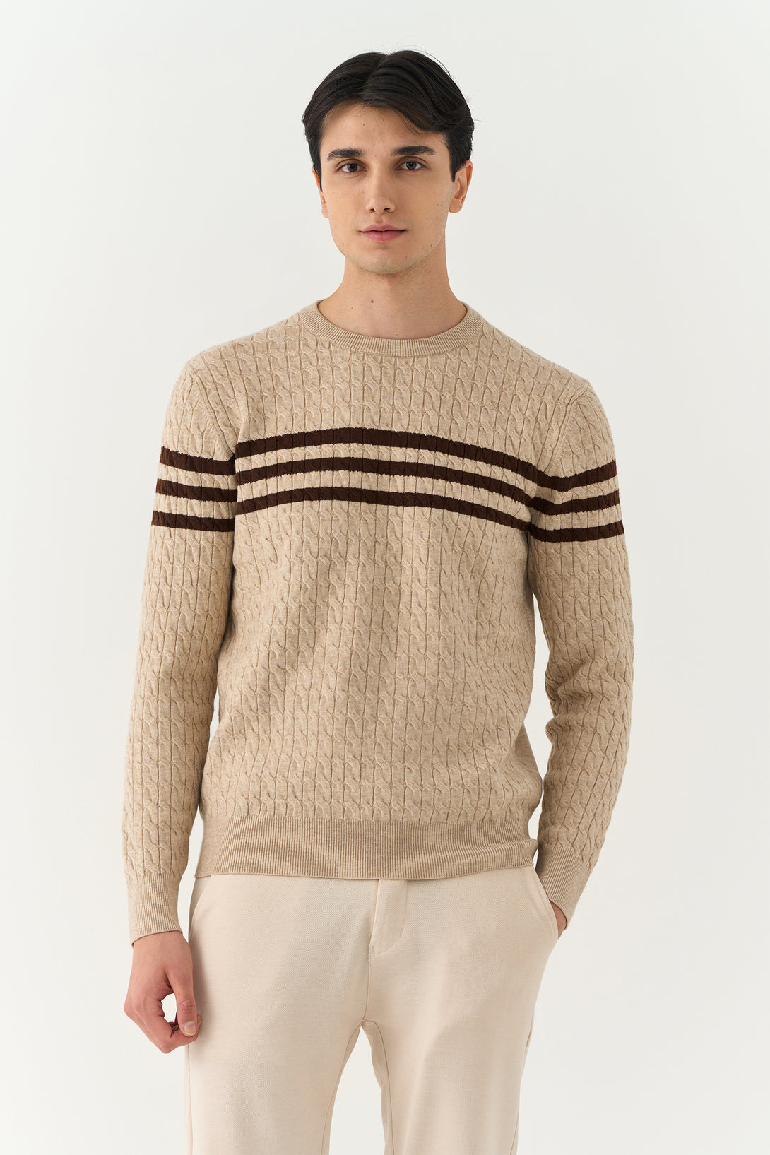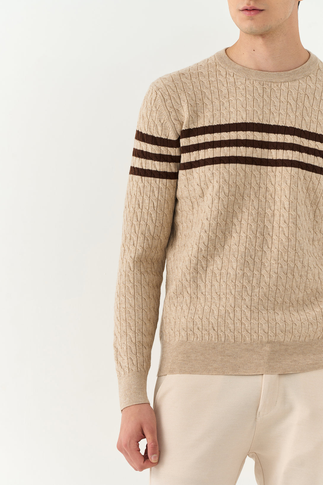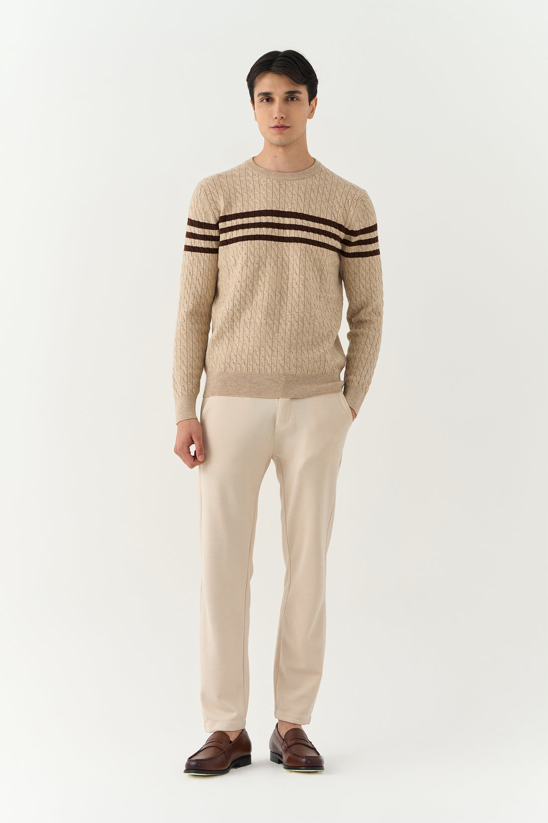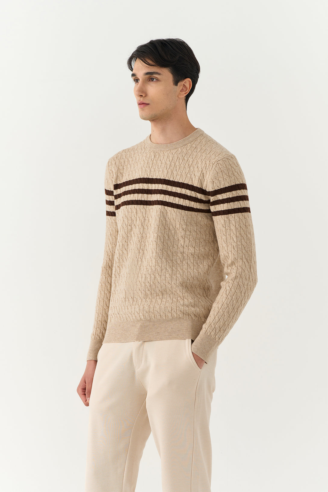A refined winter classic, the Beige Cable-Knit Sweater offers a soft, cozy feel with a sophisticated textured pattern.