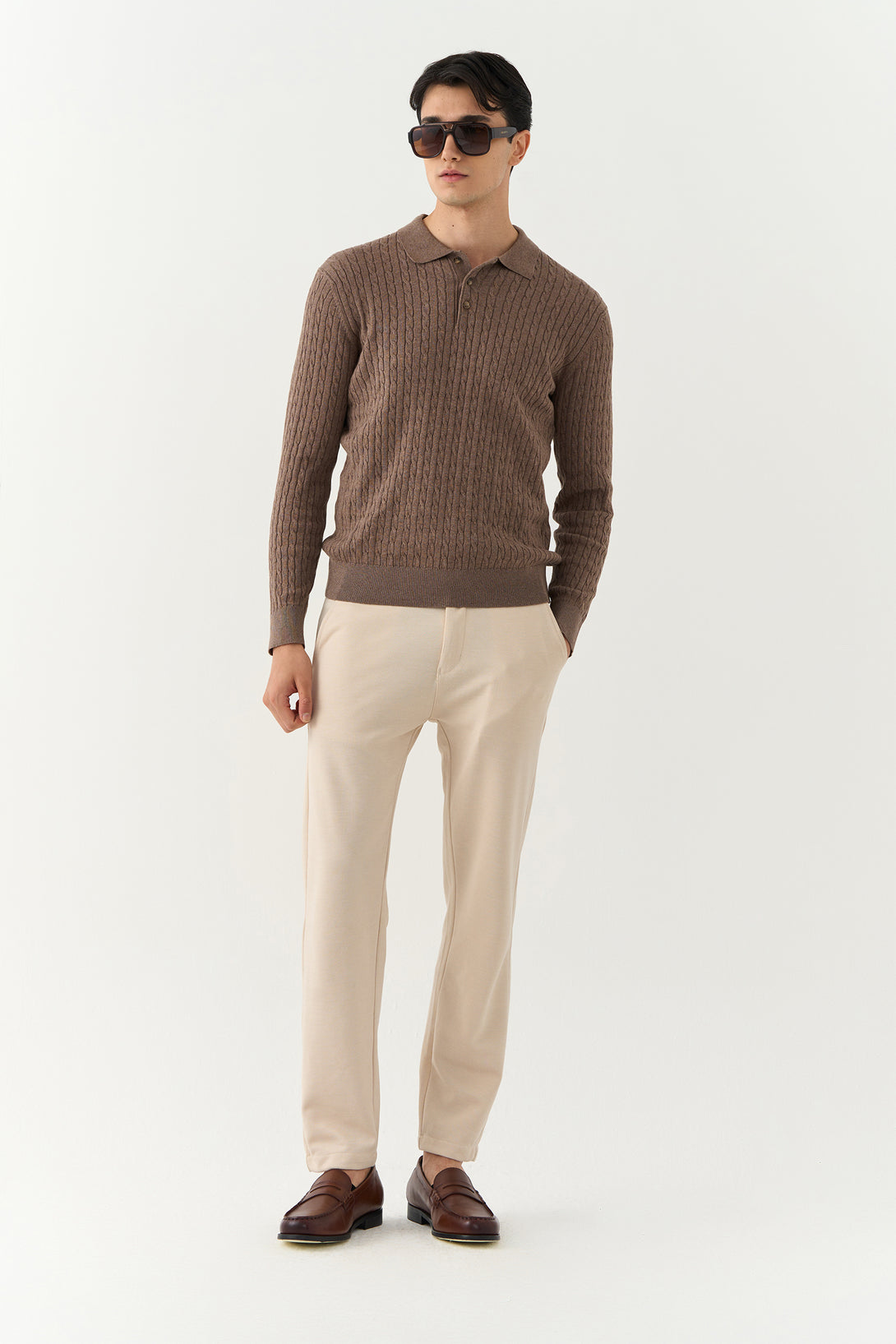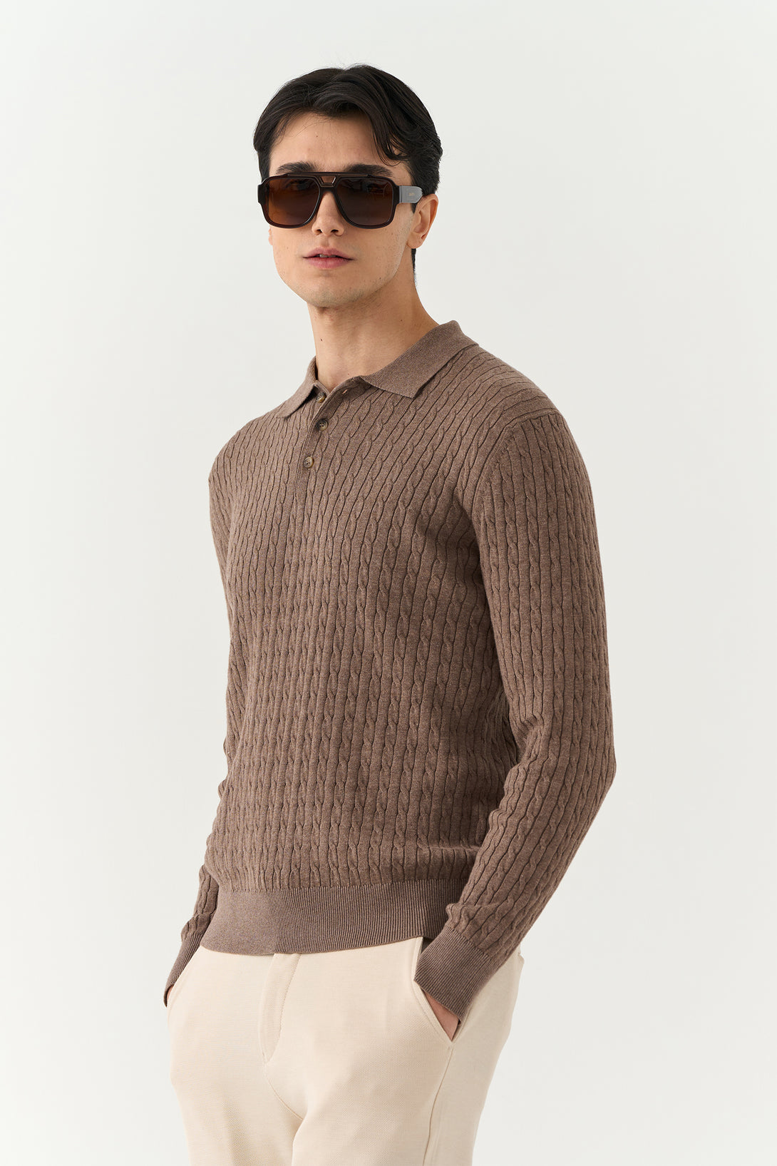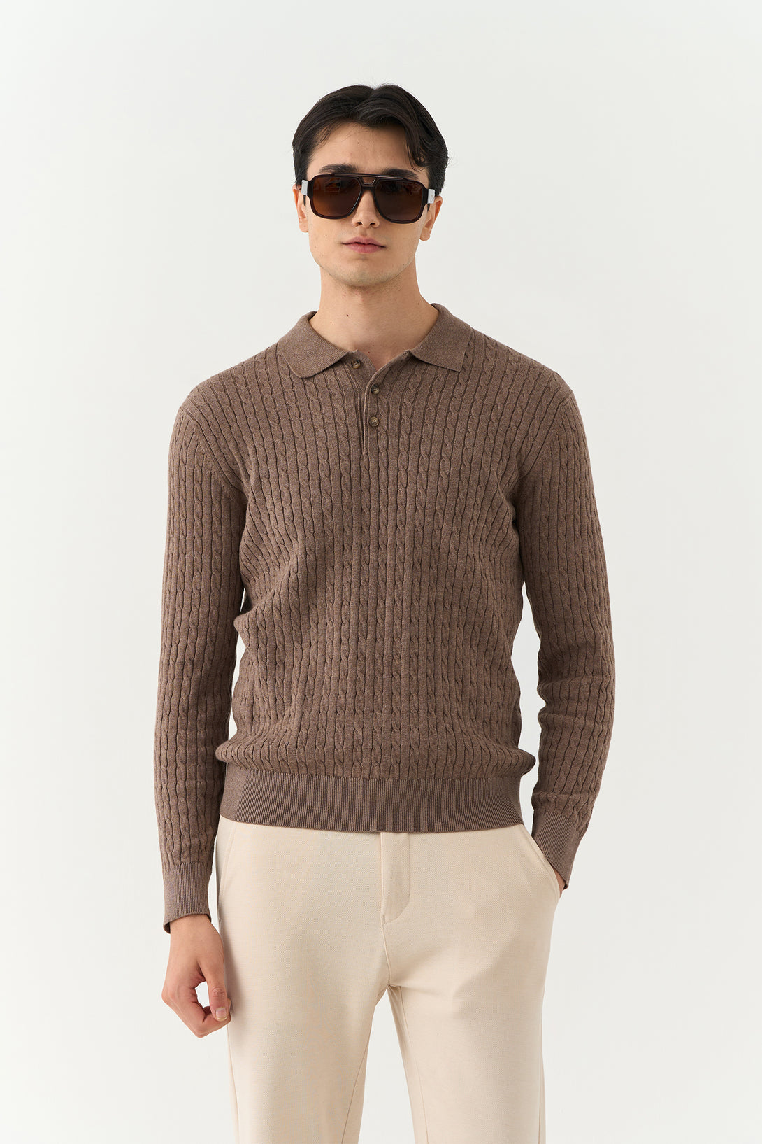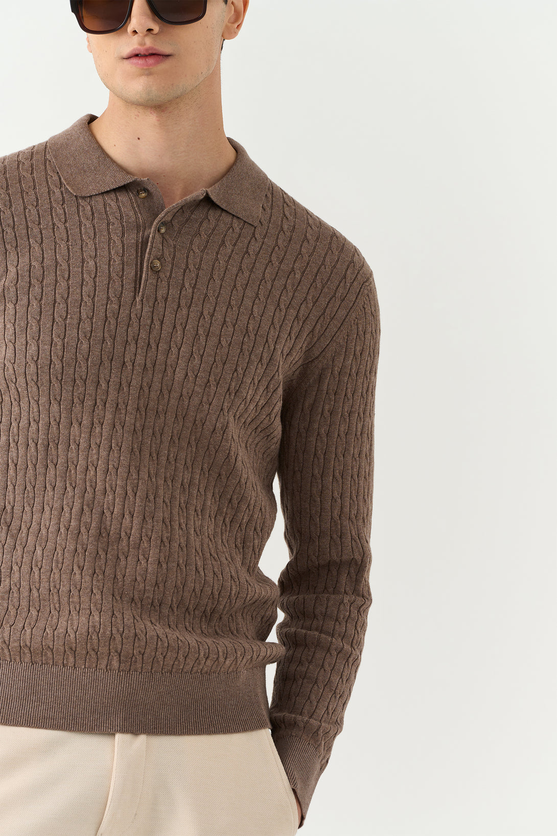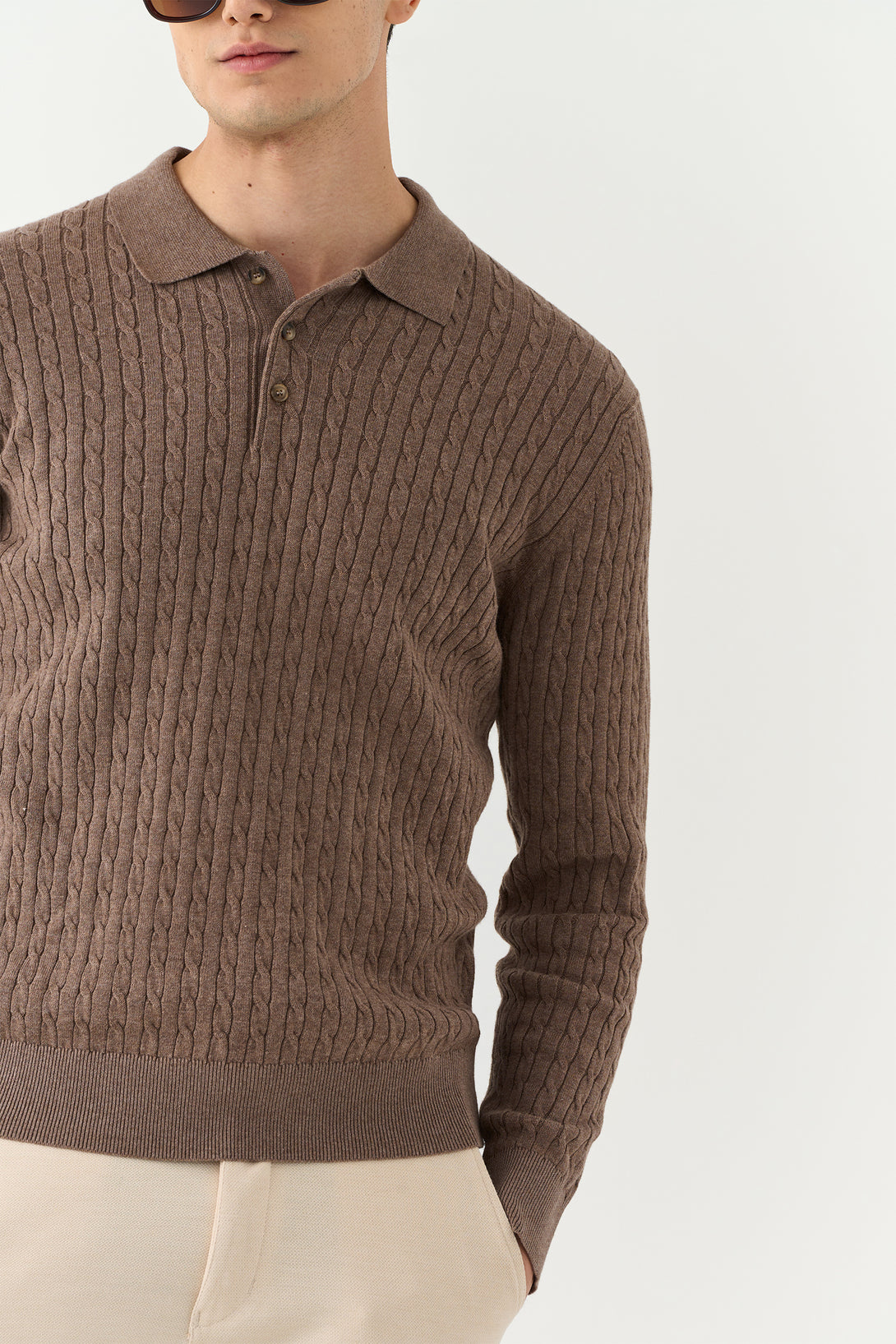 Elevated yet comfortable, the Caramel Brown Polo Sweater features a refined collar with a smooth knitted construction—ideal for smart winter dressing.