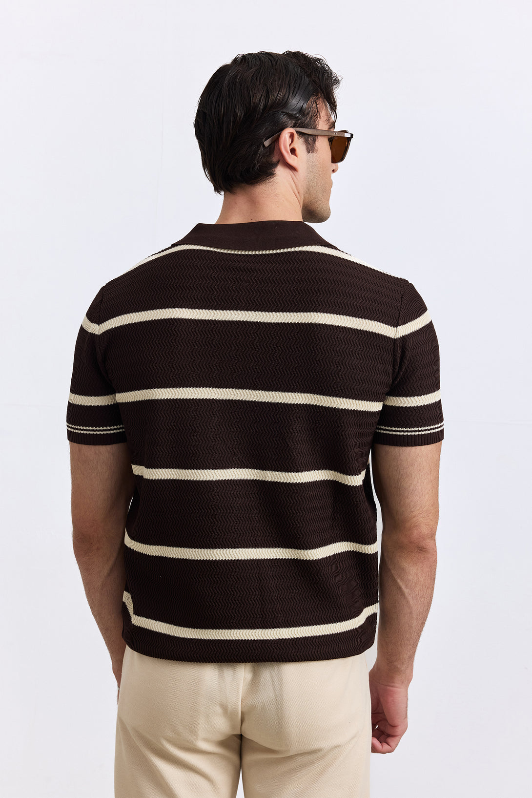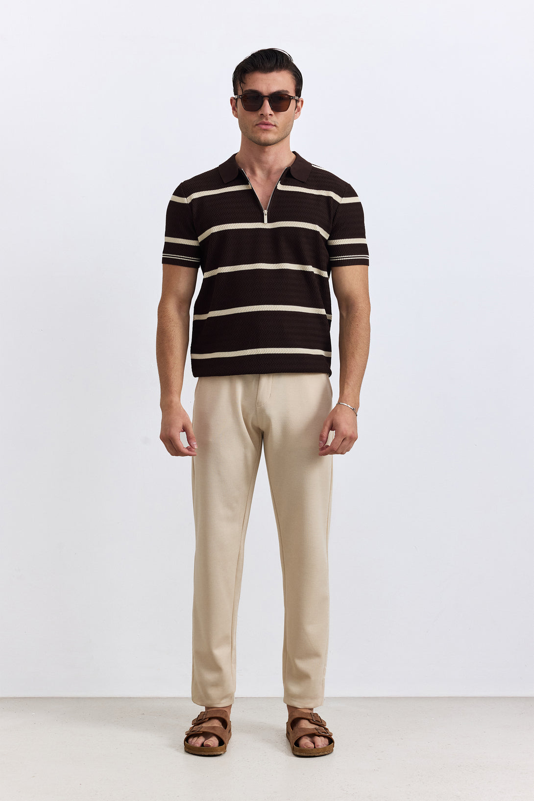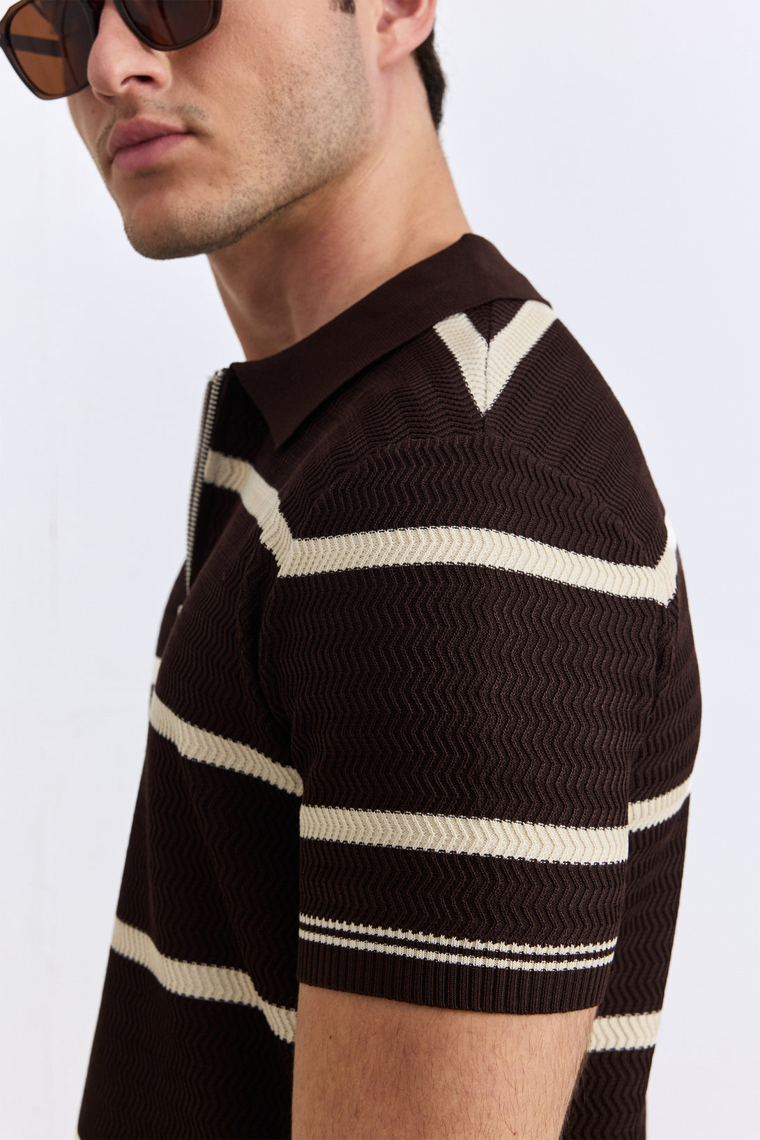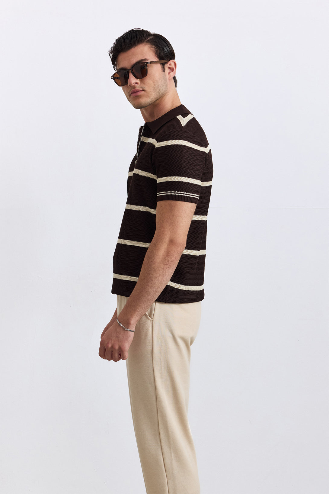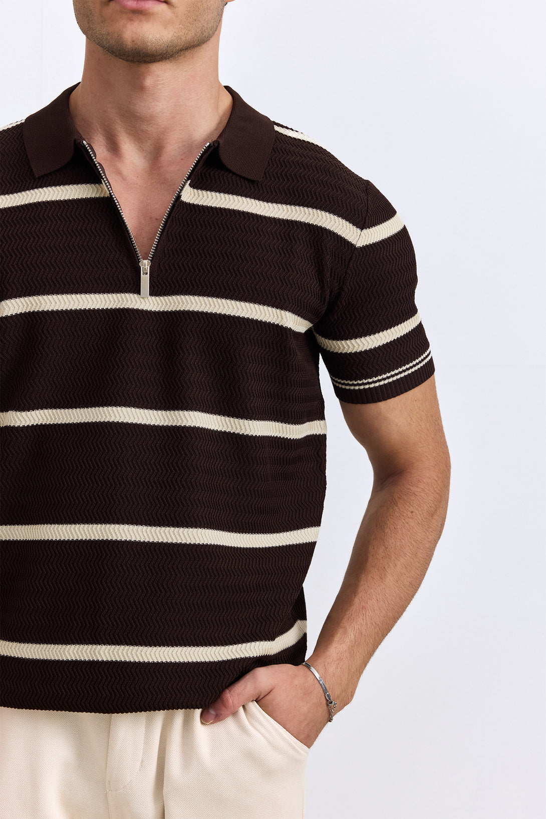 A modern twist on a classic, the Coffee Knitted Zipper Polo offers a rich tone with a sleek zip-up design. Perfect for smart-casual summer styling.