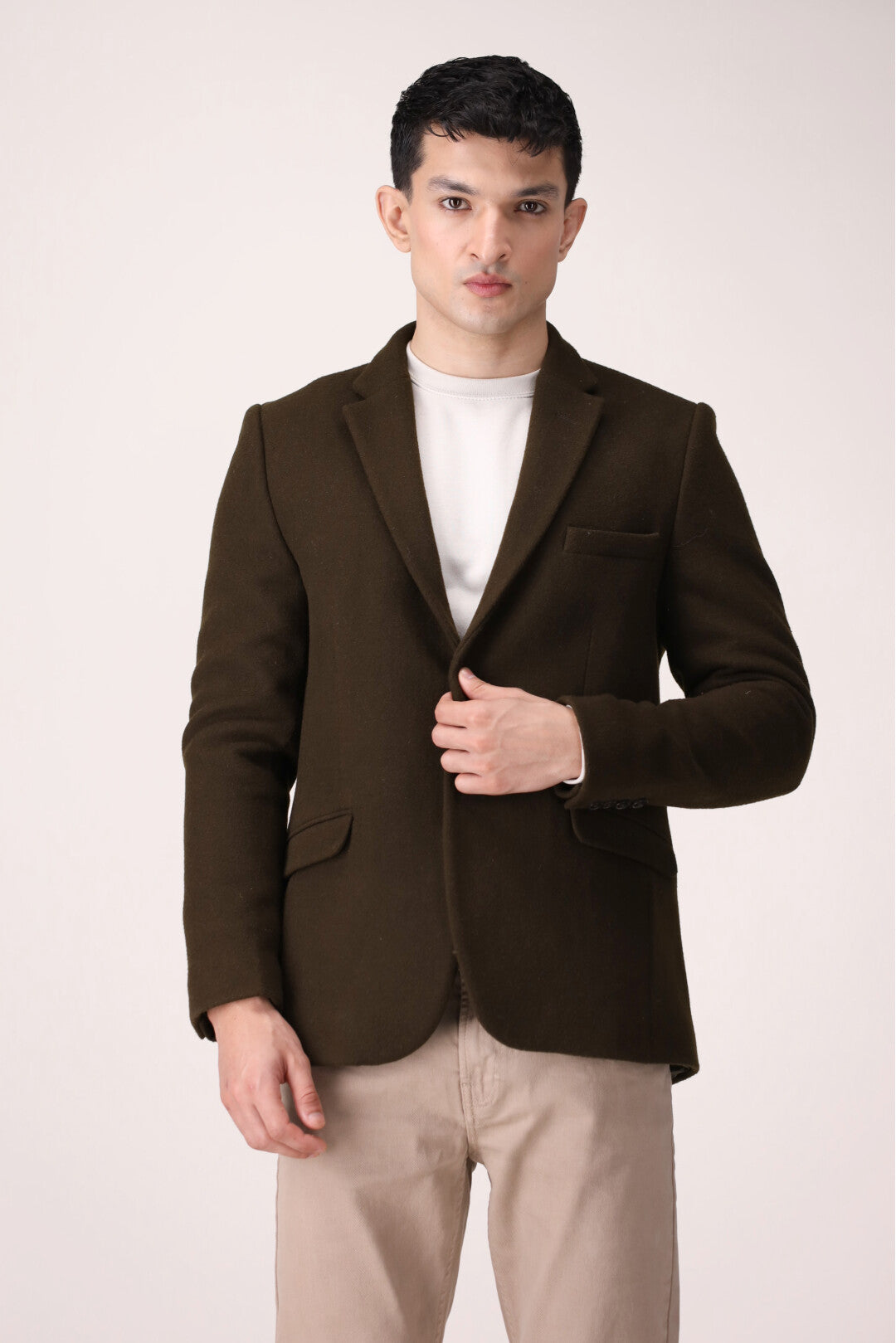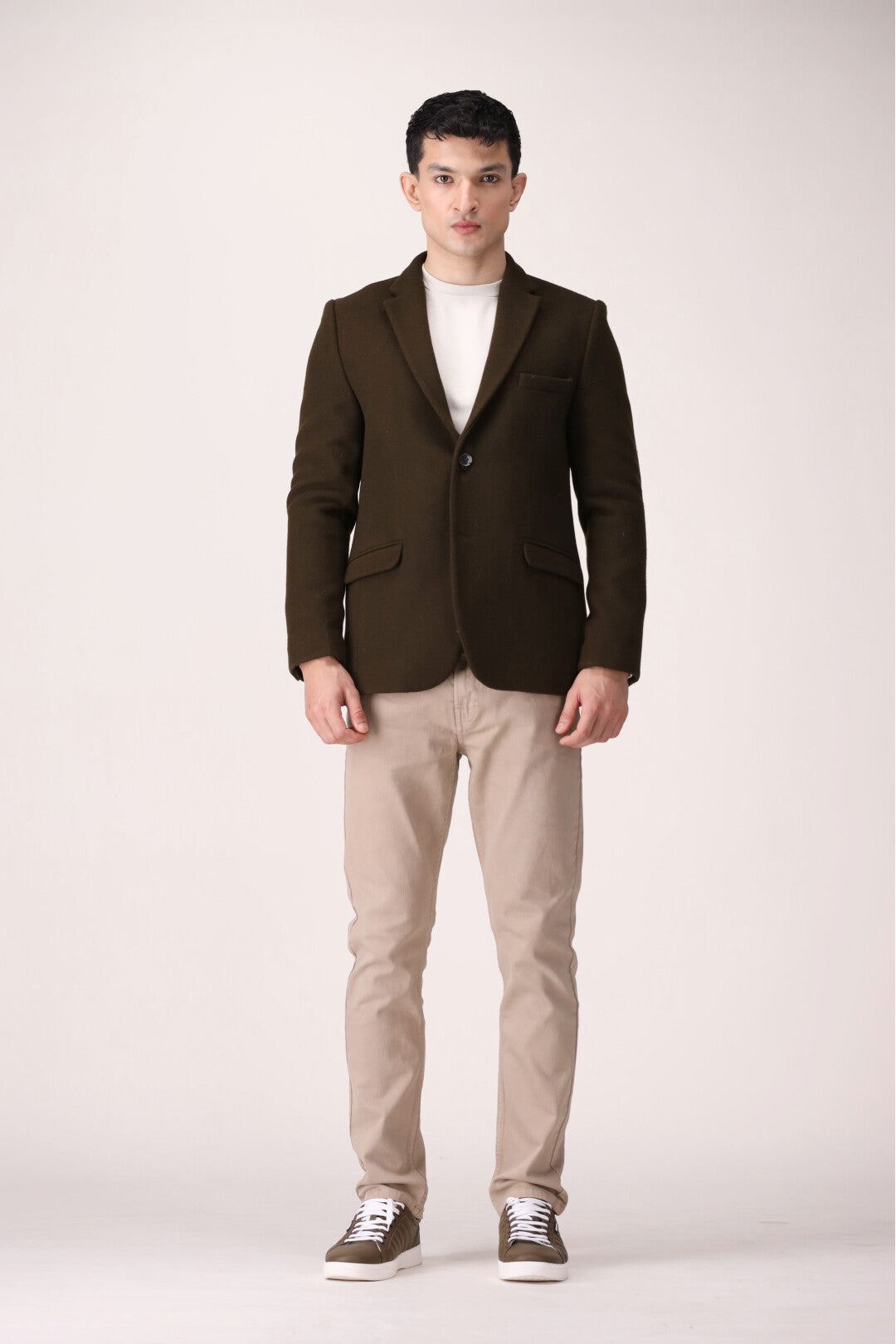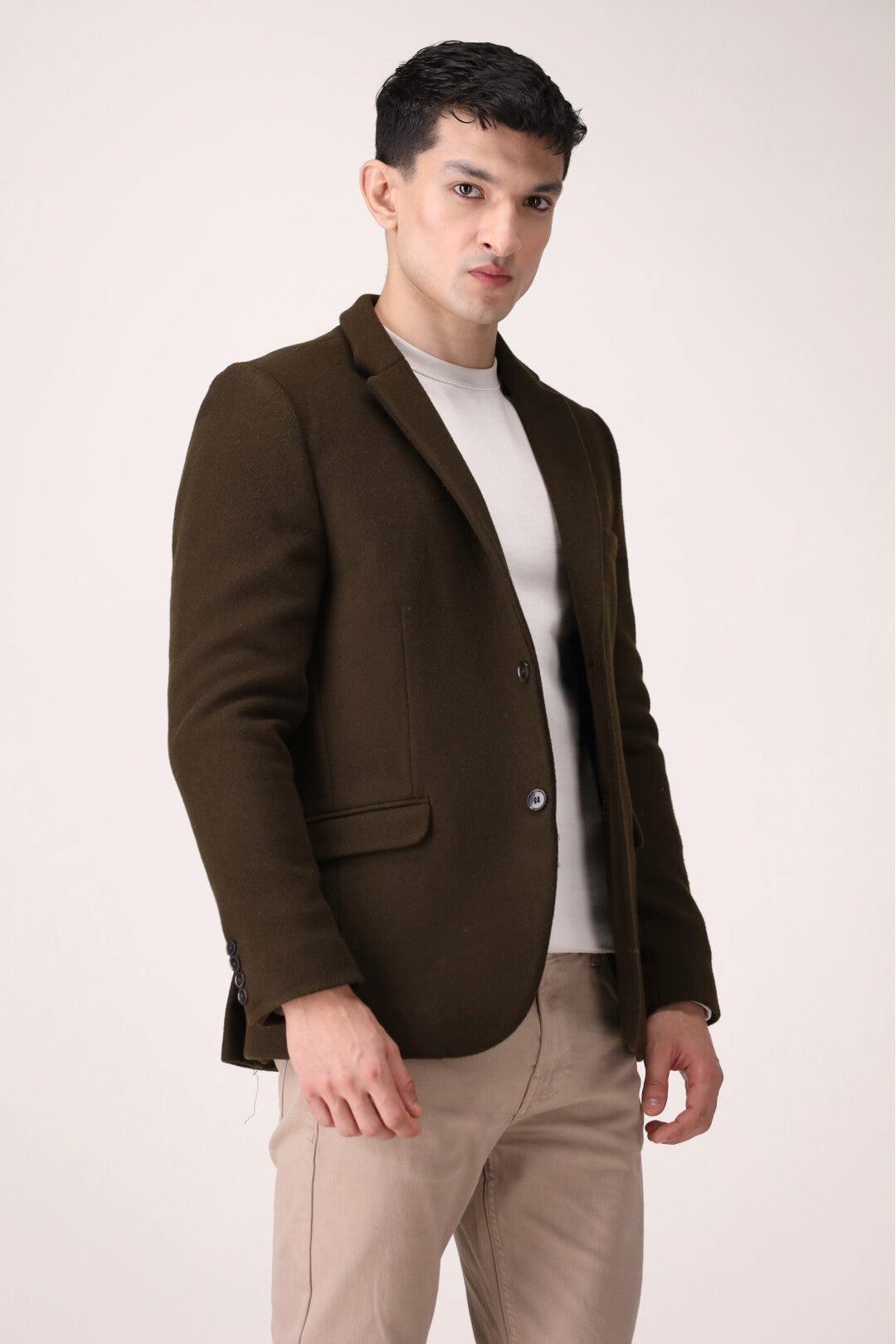 Winter slim fit coats featuring notch collar style, with two buttons fastening and two side vents.