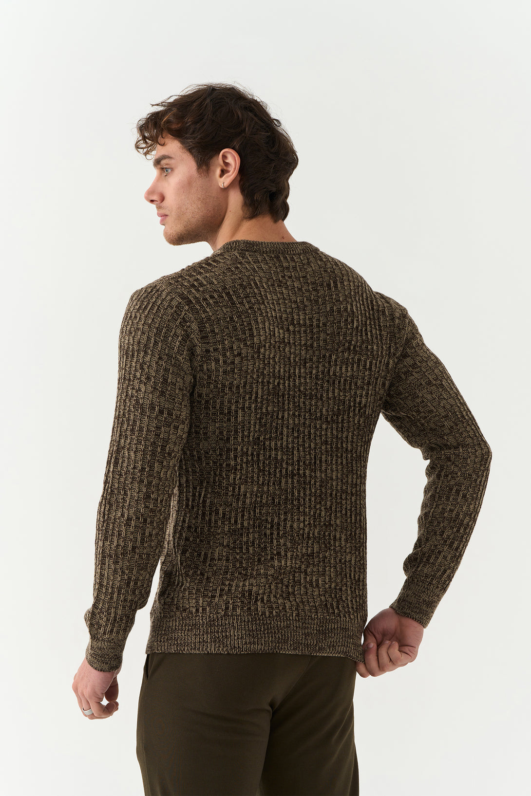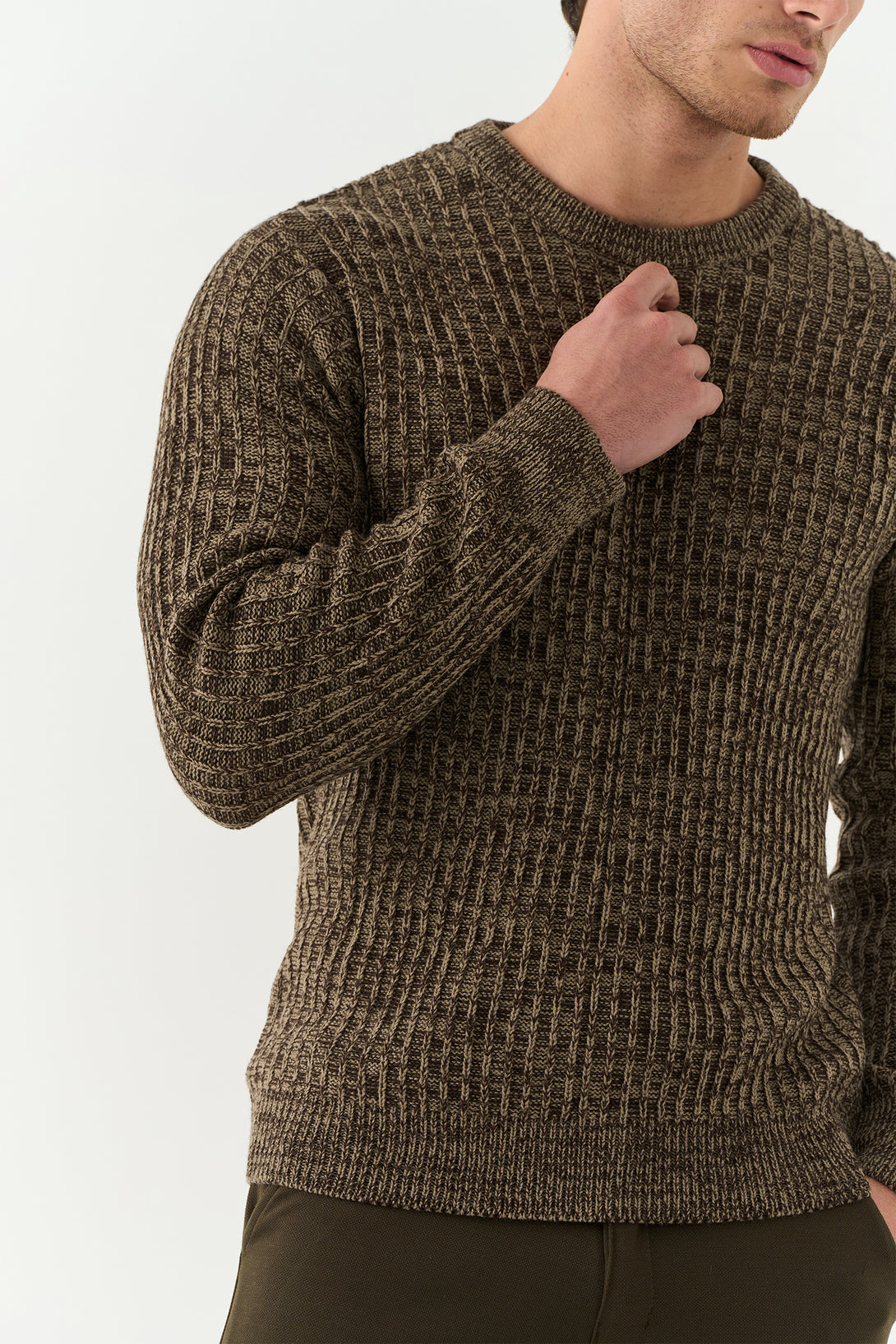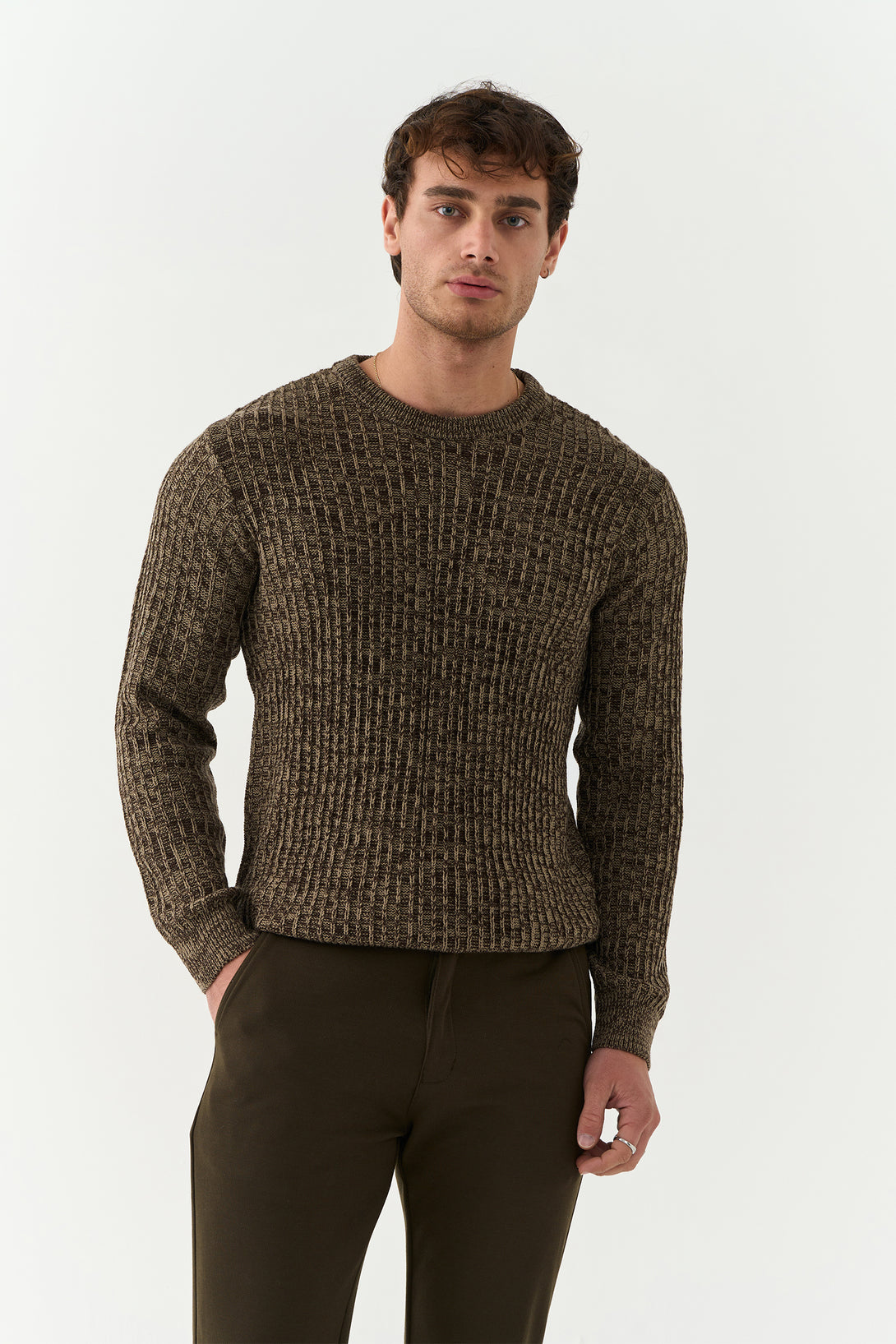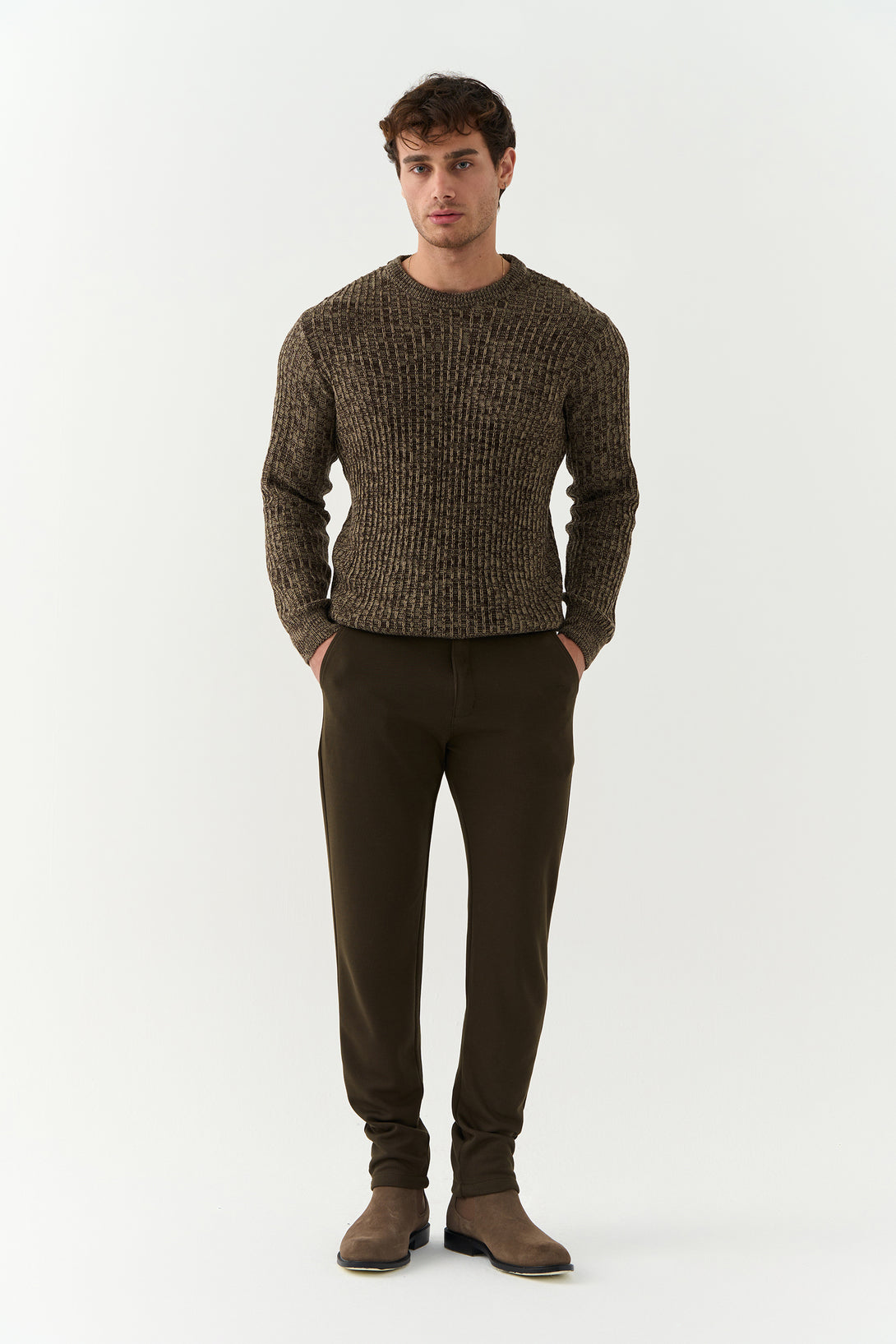 The Walnut Brown Pekka Structured Sweater combines texture and tone for a contemporary winter look. With its defined knit pattern and earthy brown hue, it’s designed for the man who values comfort with character.
