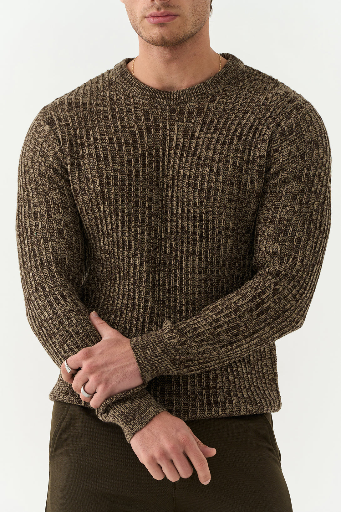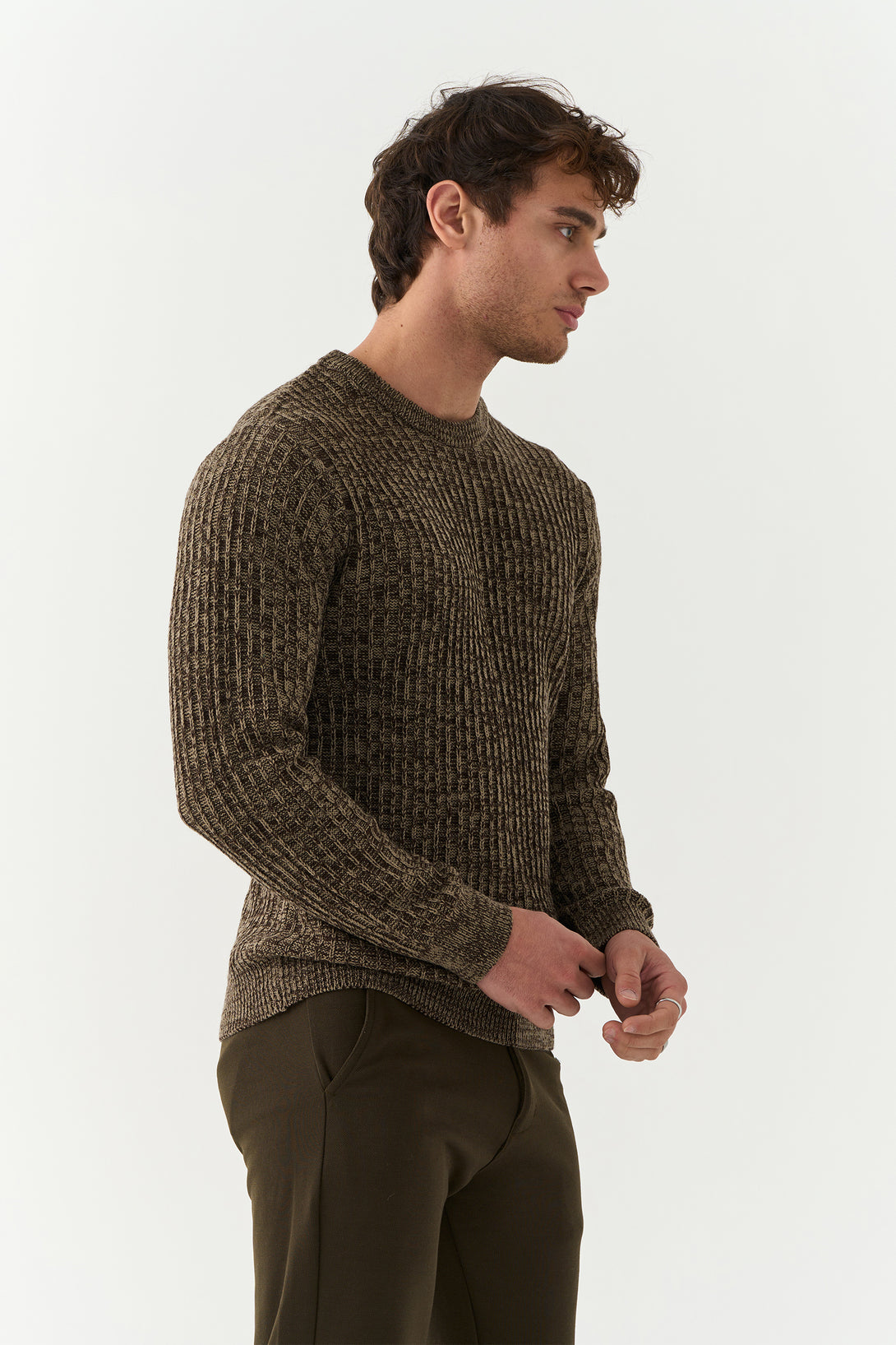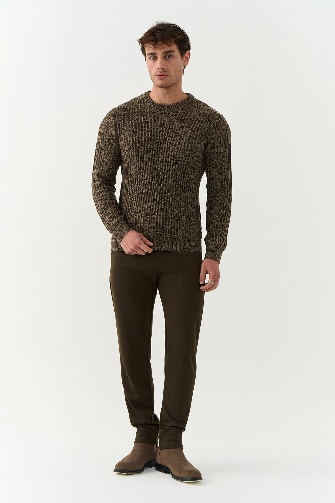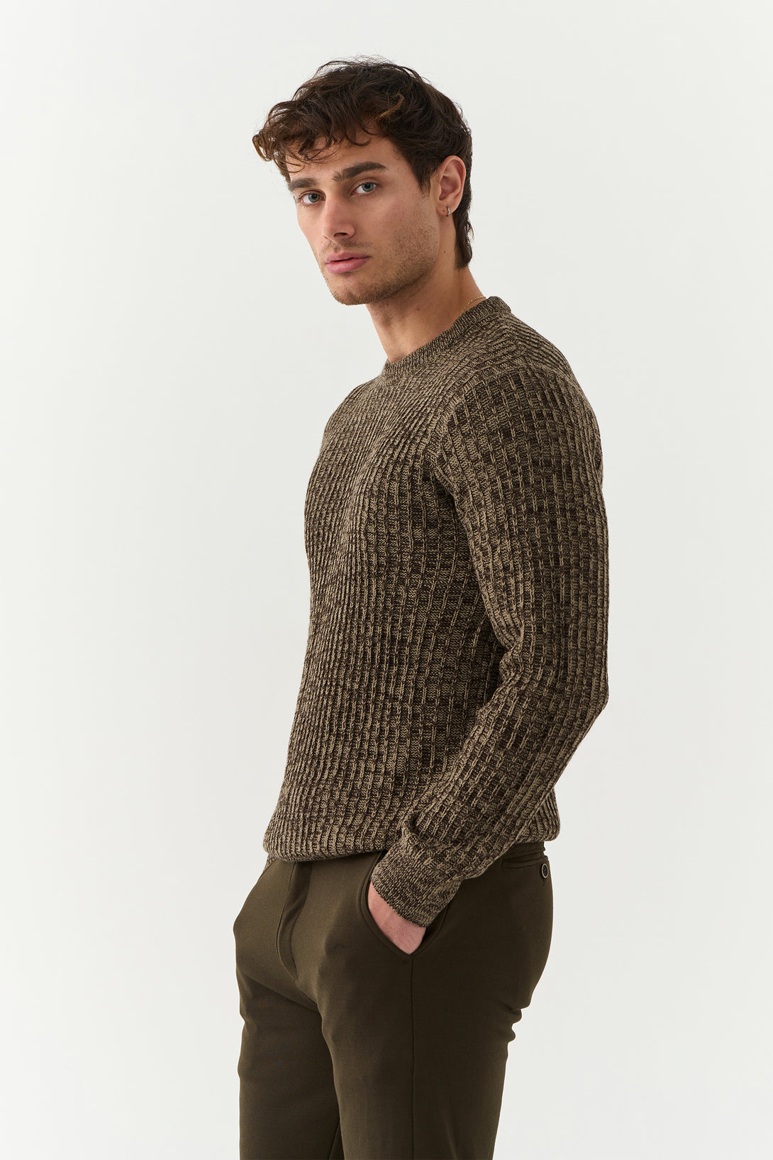 The Walnut Brown Pekka Structured Sweater combines texture and tone for a contemporary winter look. With its defined knit pattern and earthy brown hue, it’s designed for the man who values comfort with character.