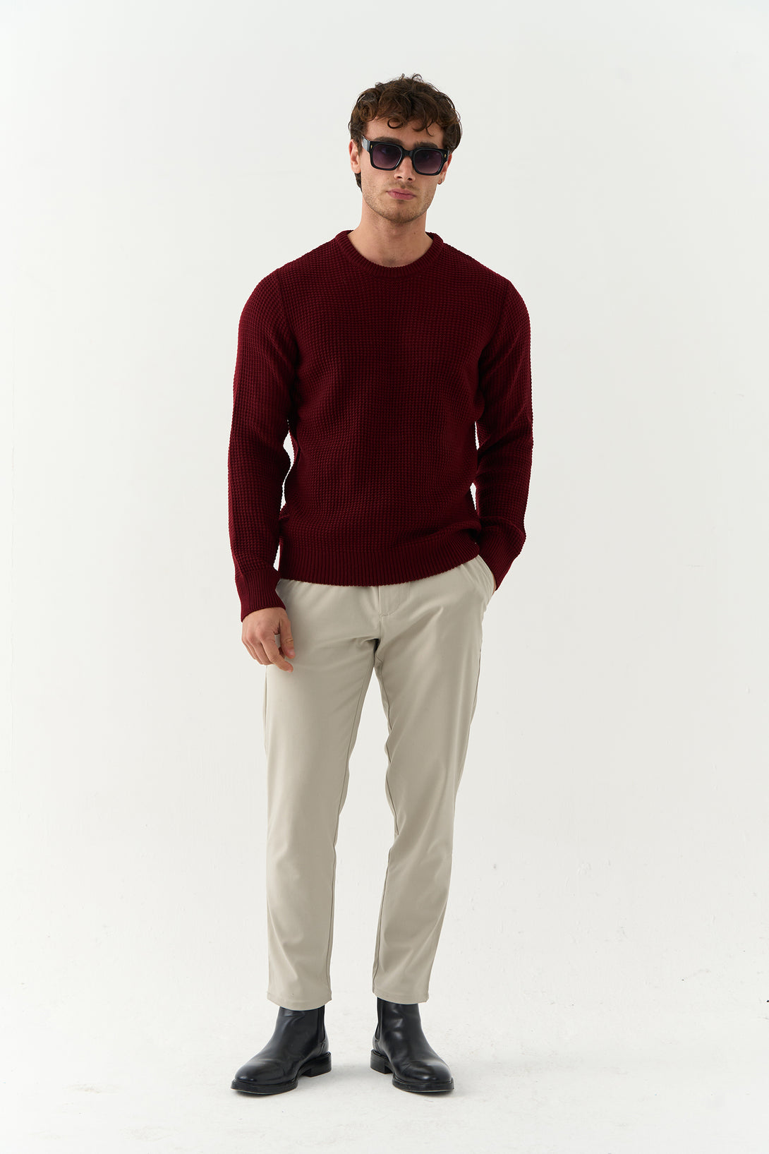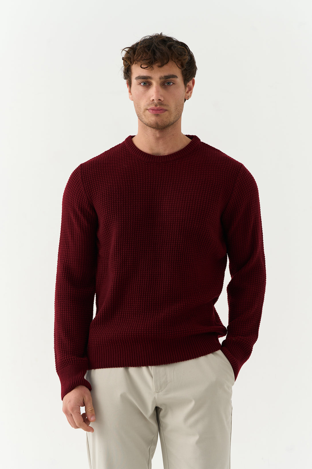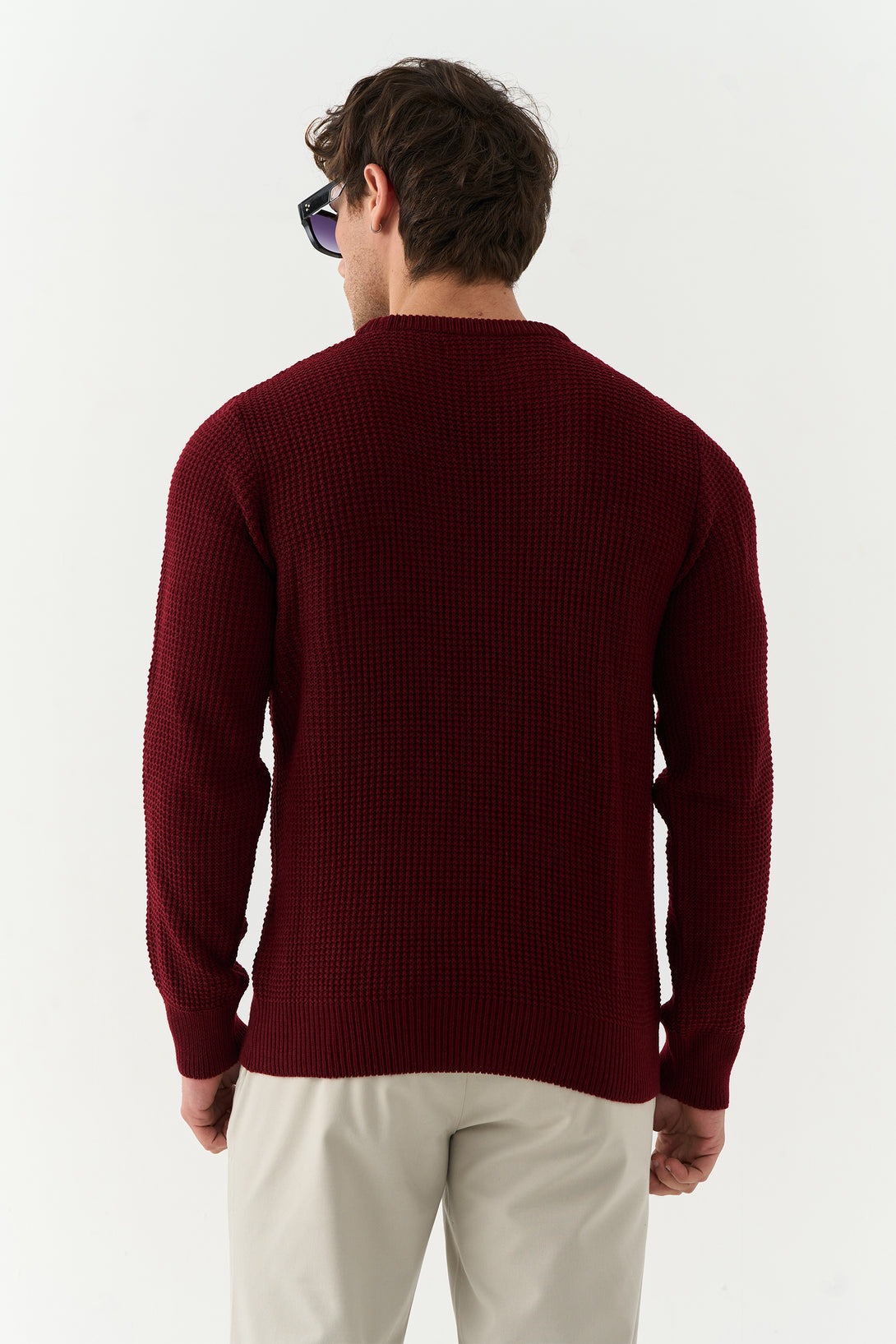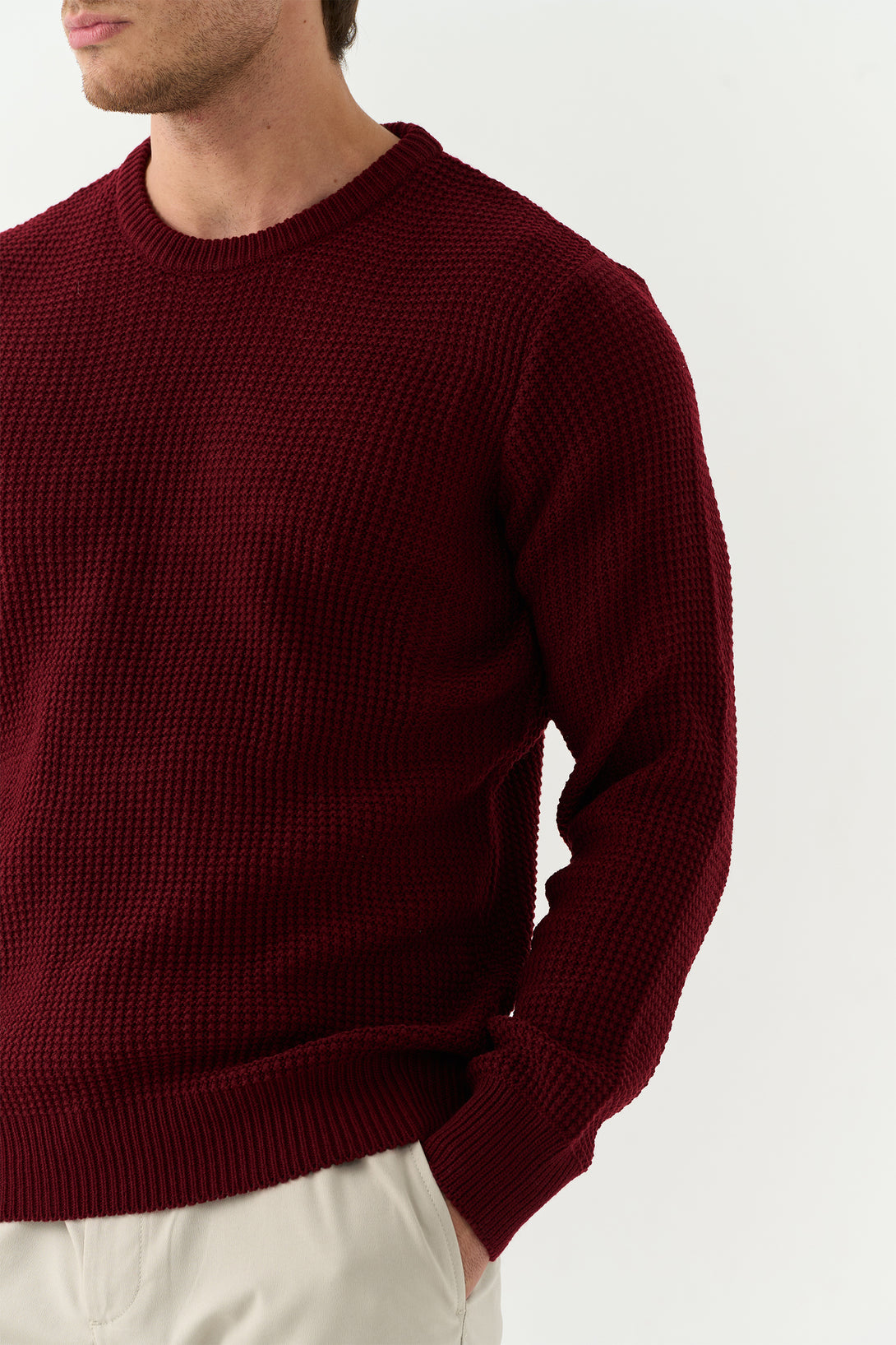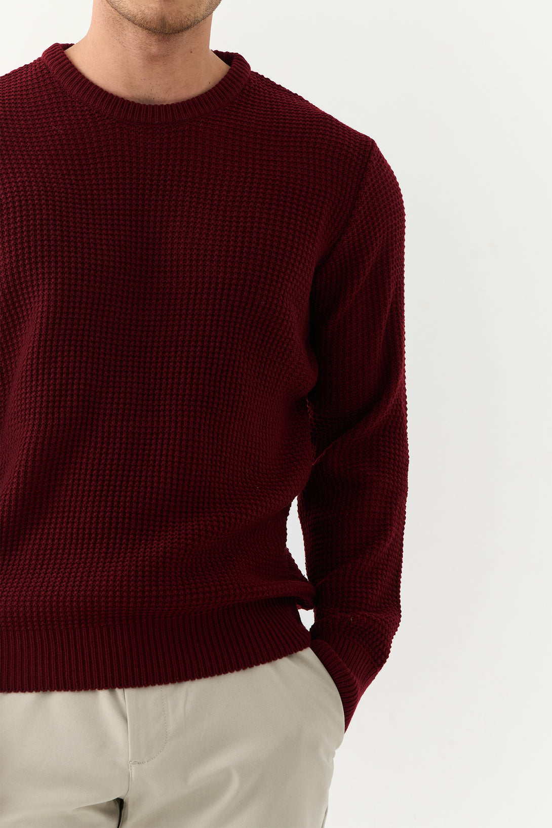 Warmth meets bold design in the Red Waffle Knit Sweater. The signature waffle texture enhances breathability while maintaining a cozy feel, perfect for both casual and semi-formal wear.
