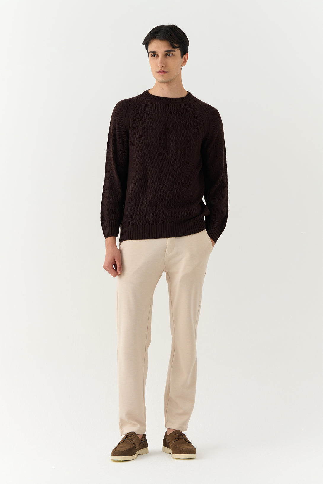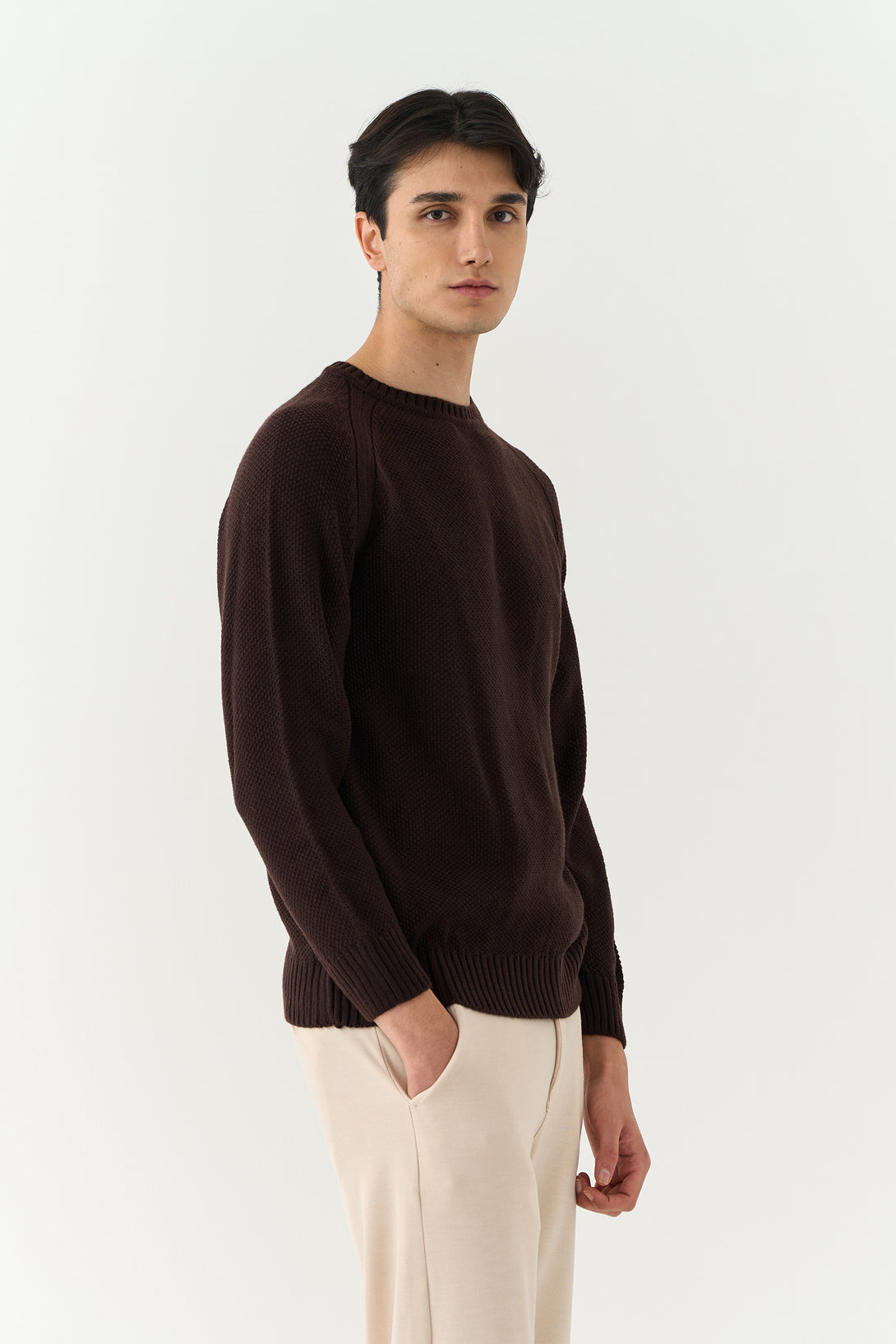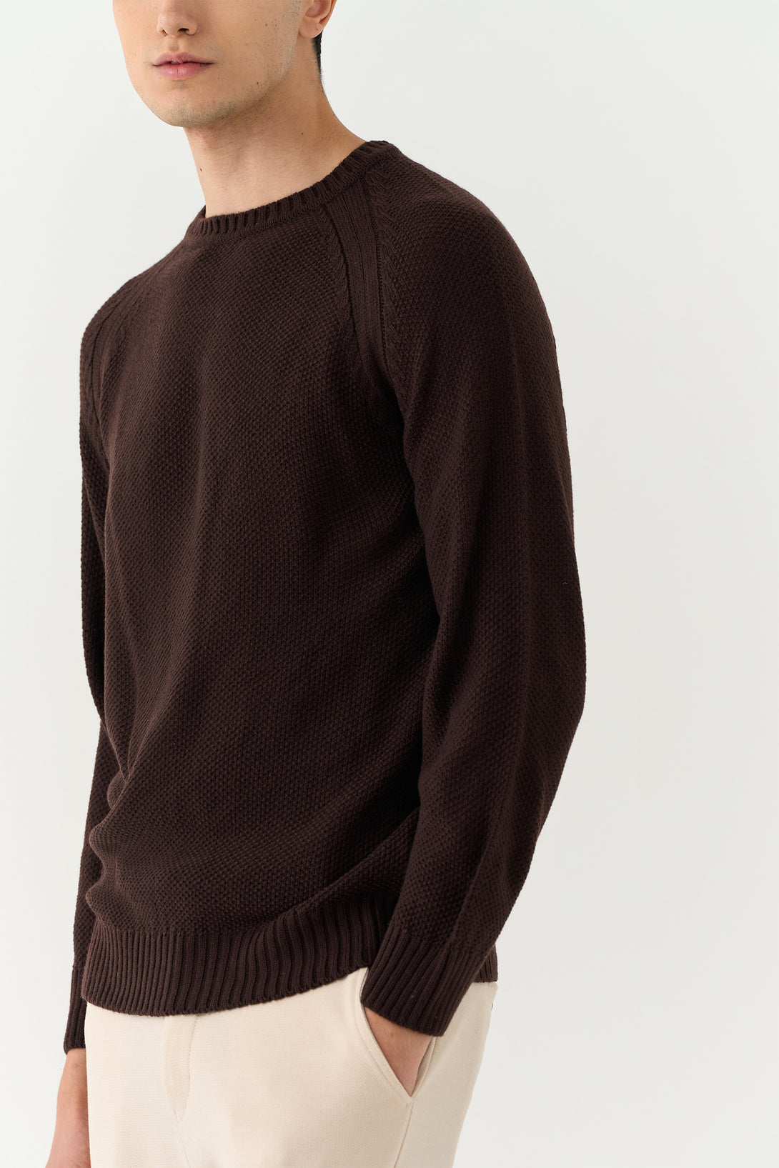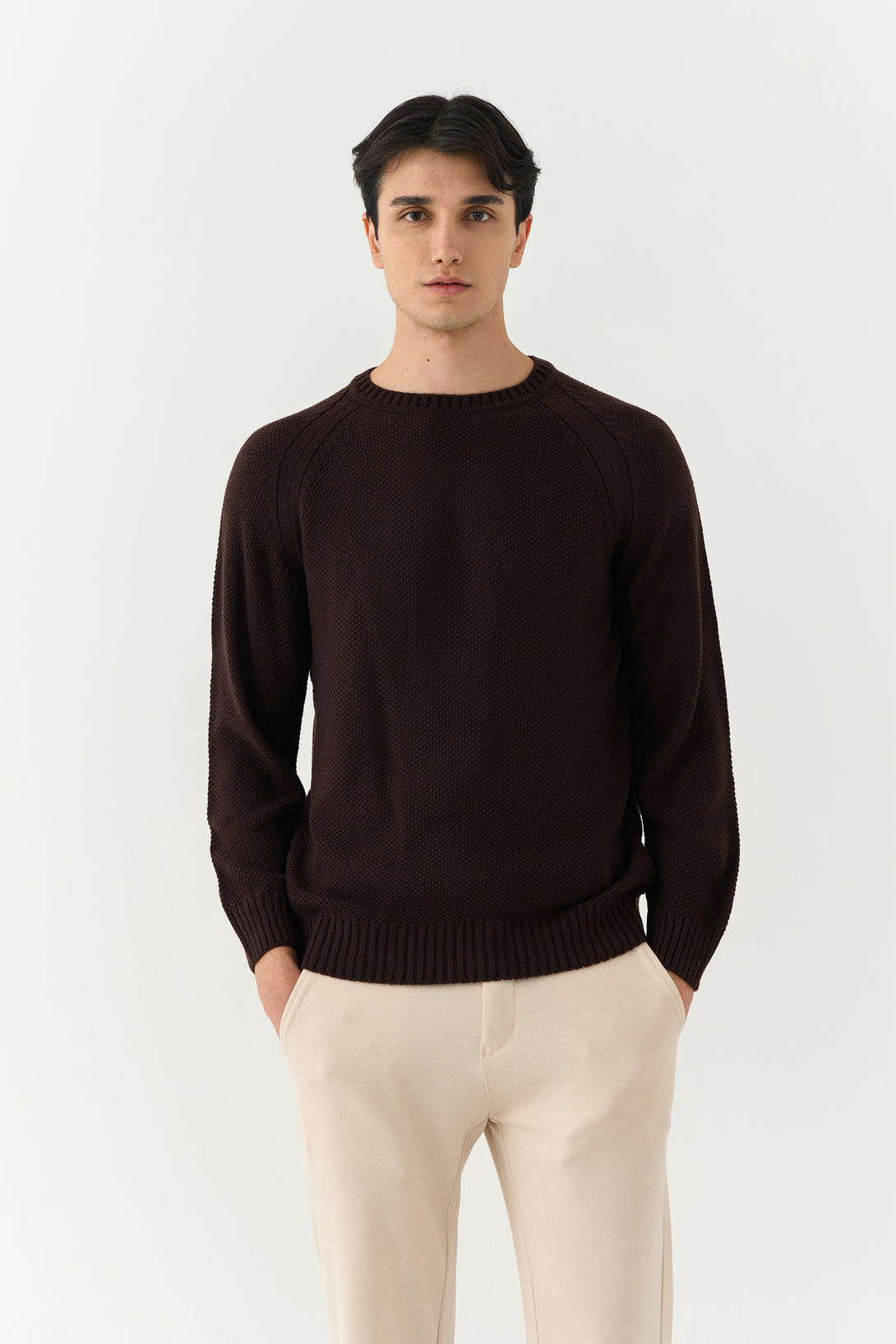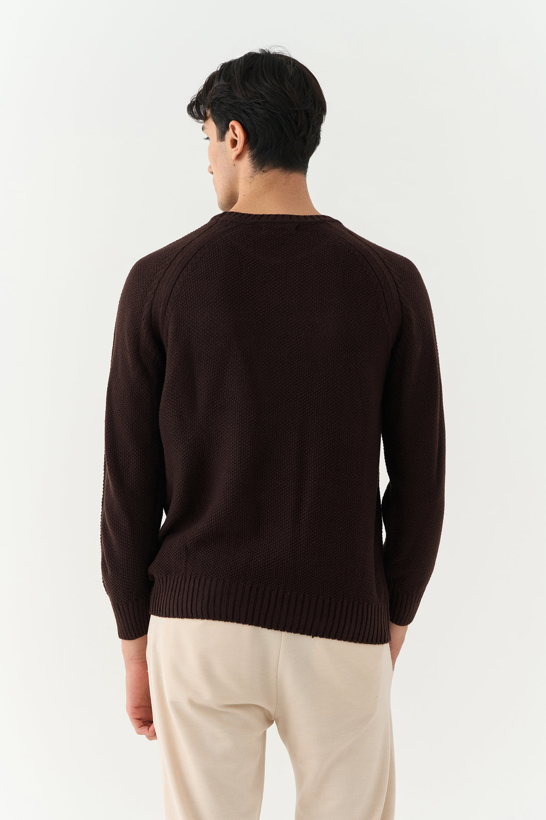 Rich in tone and texture, the Chocolate Brown Texture Knit Sweater delivers understated luxury. Its intricate weave and deep hue bring warmth and depth to any winter look.