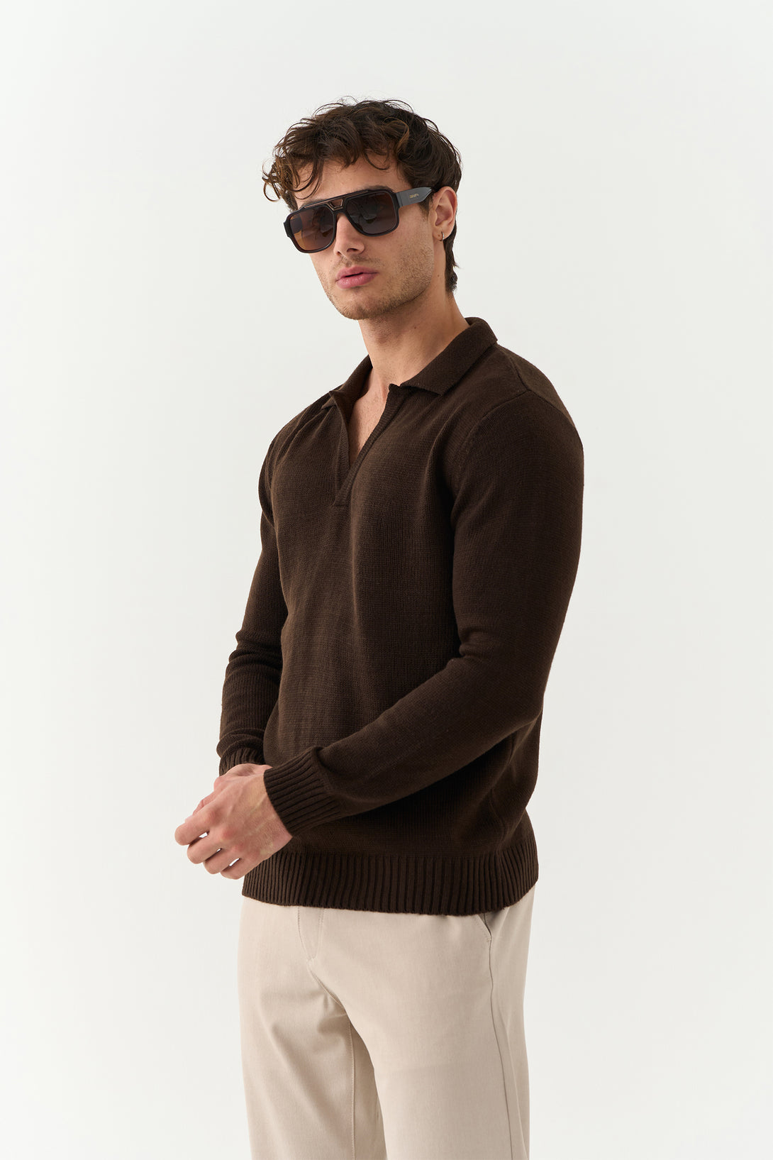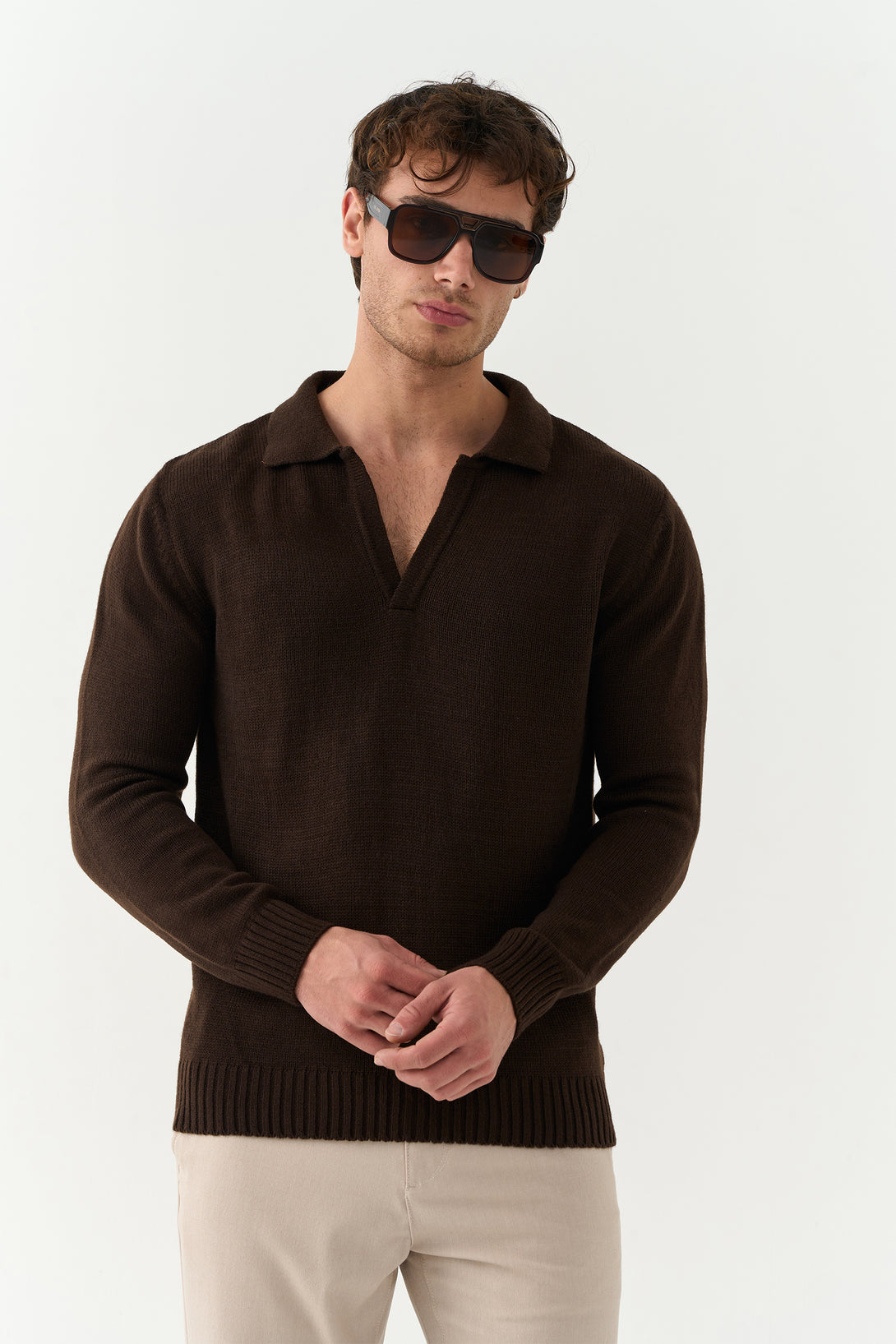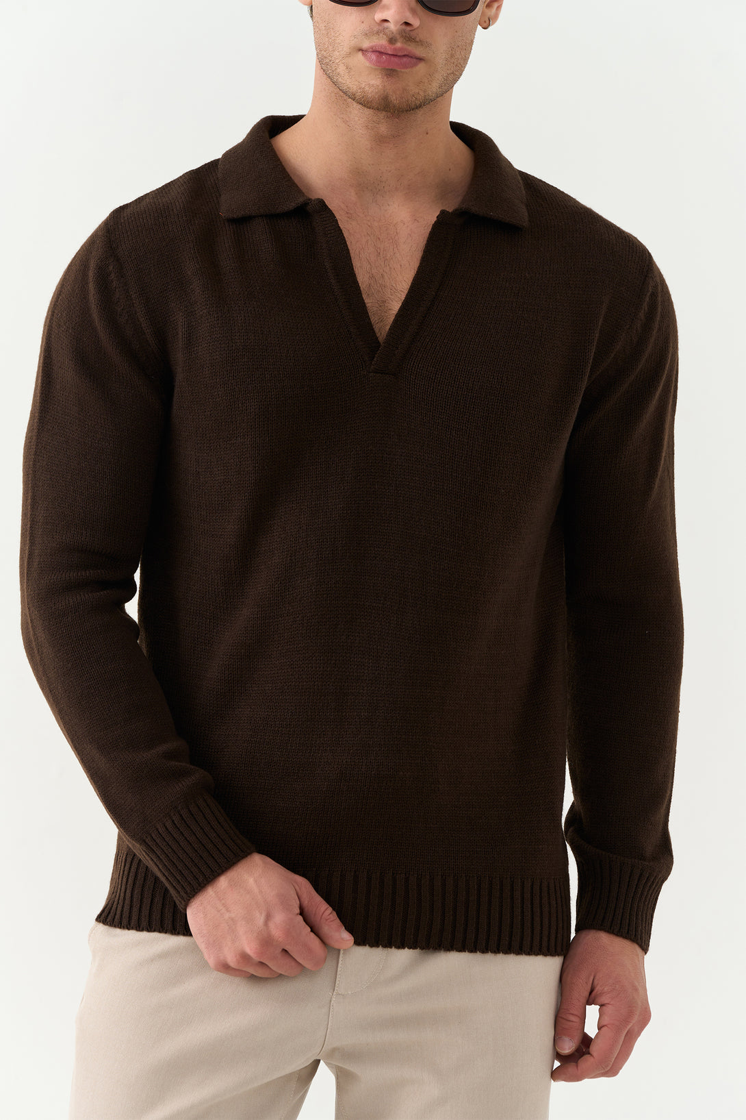 Elevated simplicity defines the Chocolate Brown Johnny Collar Sweater. Its open-collar neckline and structured knit give it a polished yet relaxed appeal, ideal for smart-casual dressing.