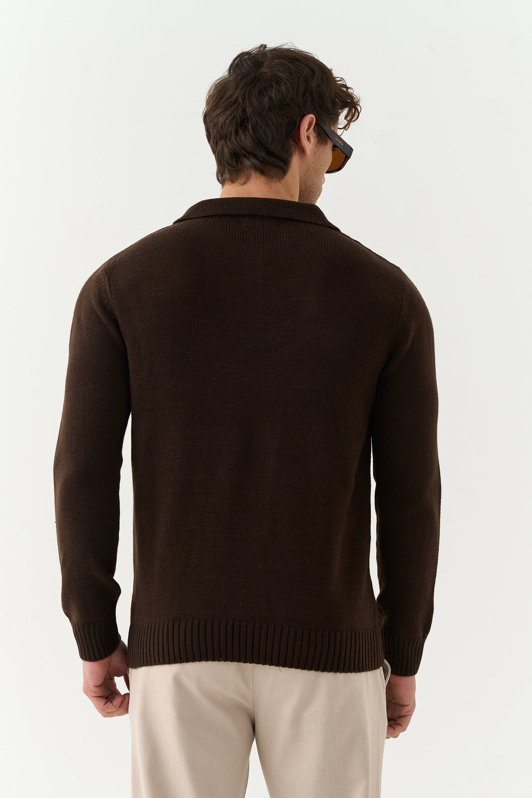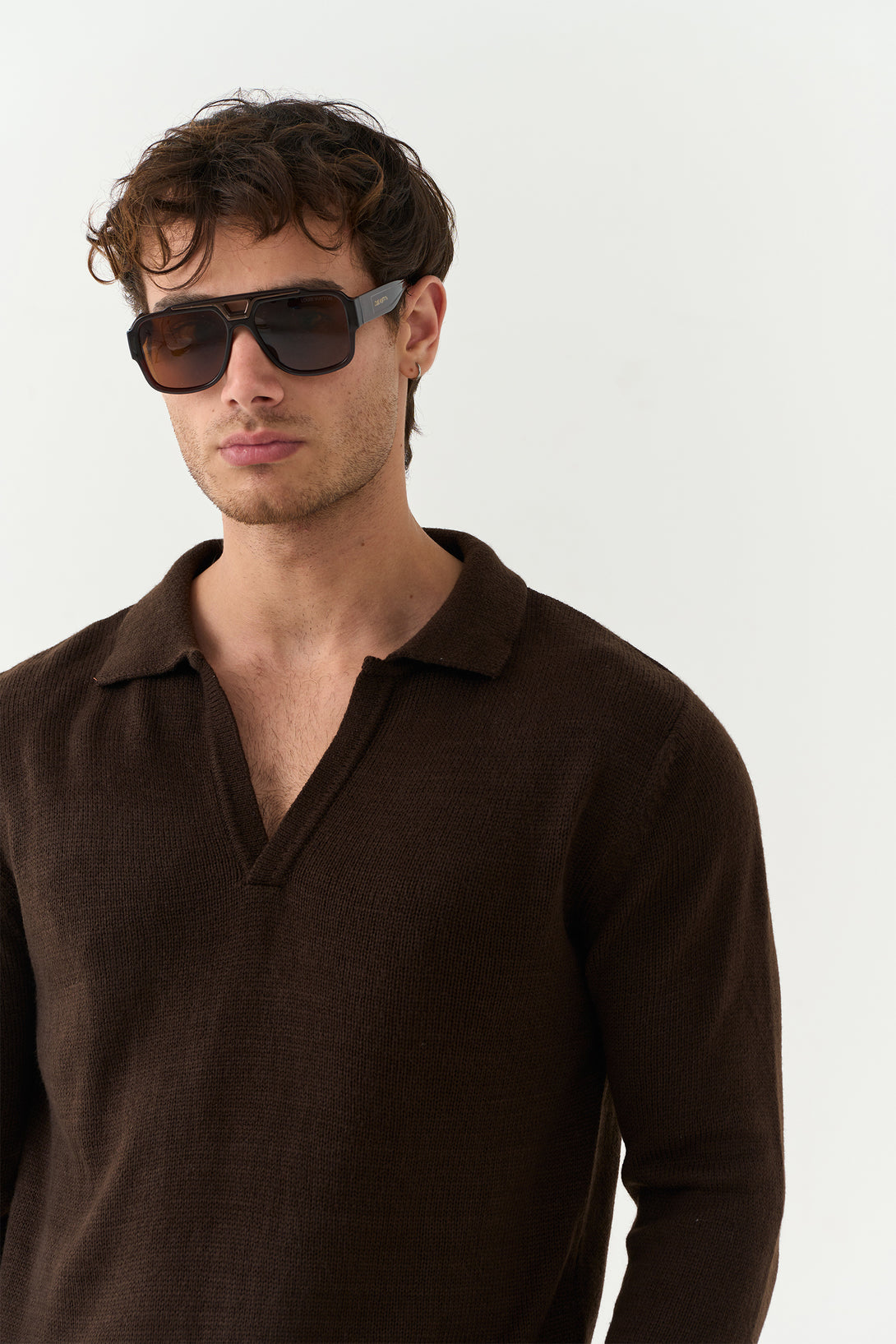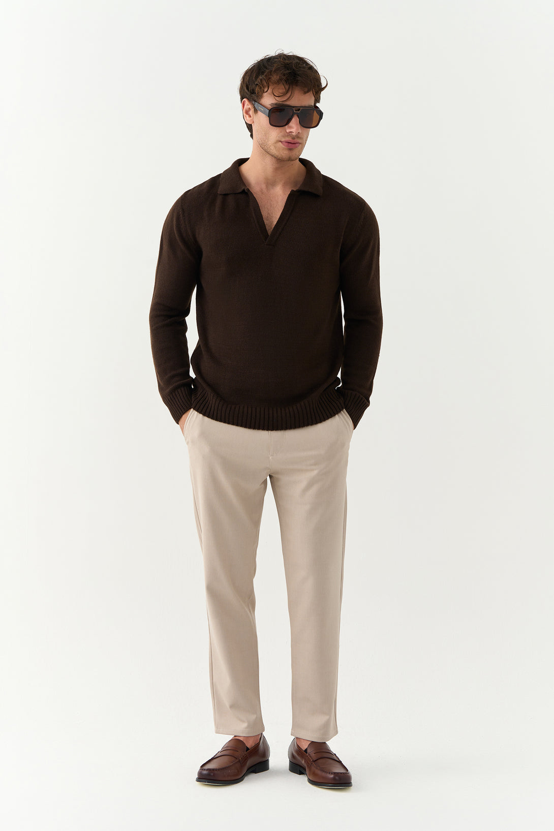 Elevated simplicity defines the Chocolate Brown Johnny Collar Sweater. Its open-collar neckline and structured knit give it a polished yet relaxed appeal, ideal for smart-casual dressing.
