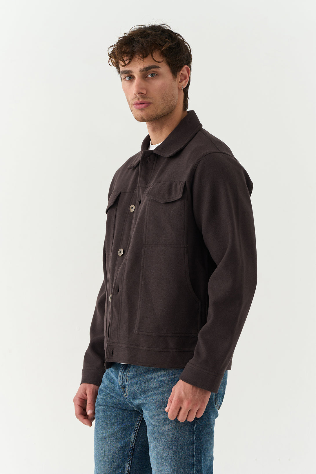 Designed for function and form, the Deep Brown Double Pocket Jacket offers utility-inspired style with a touch of elegance. Its earthy tone makes it ideal for everyday layering.