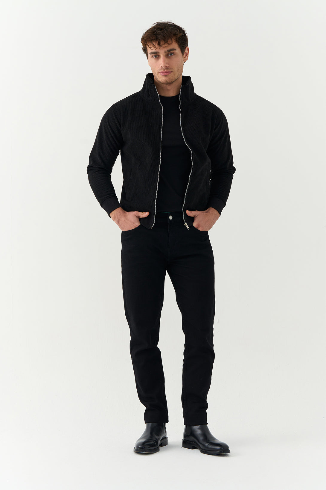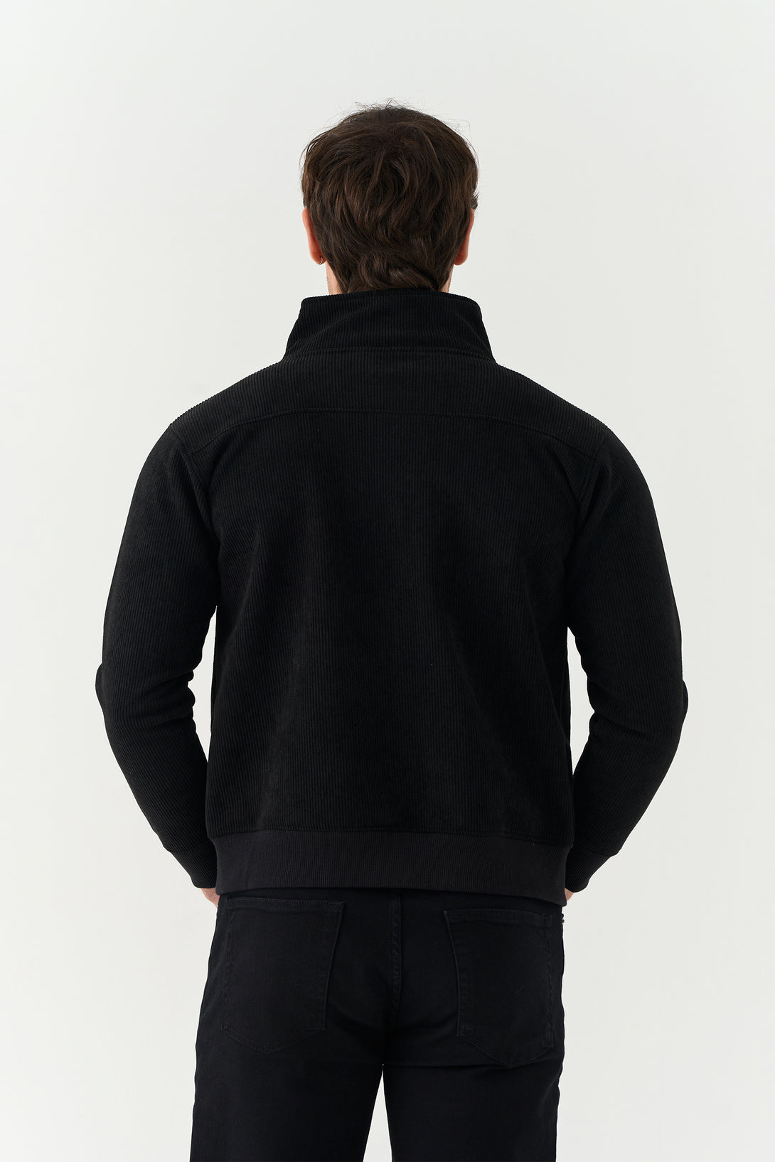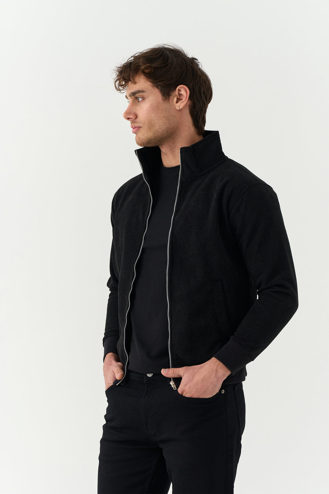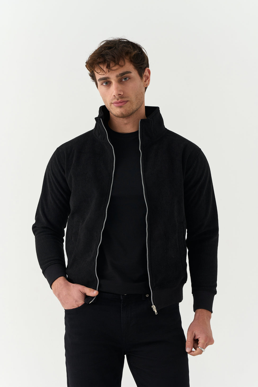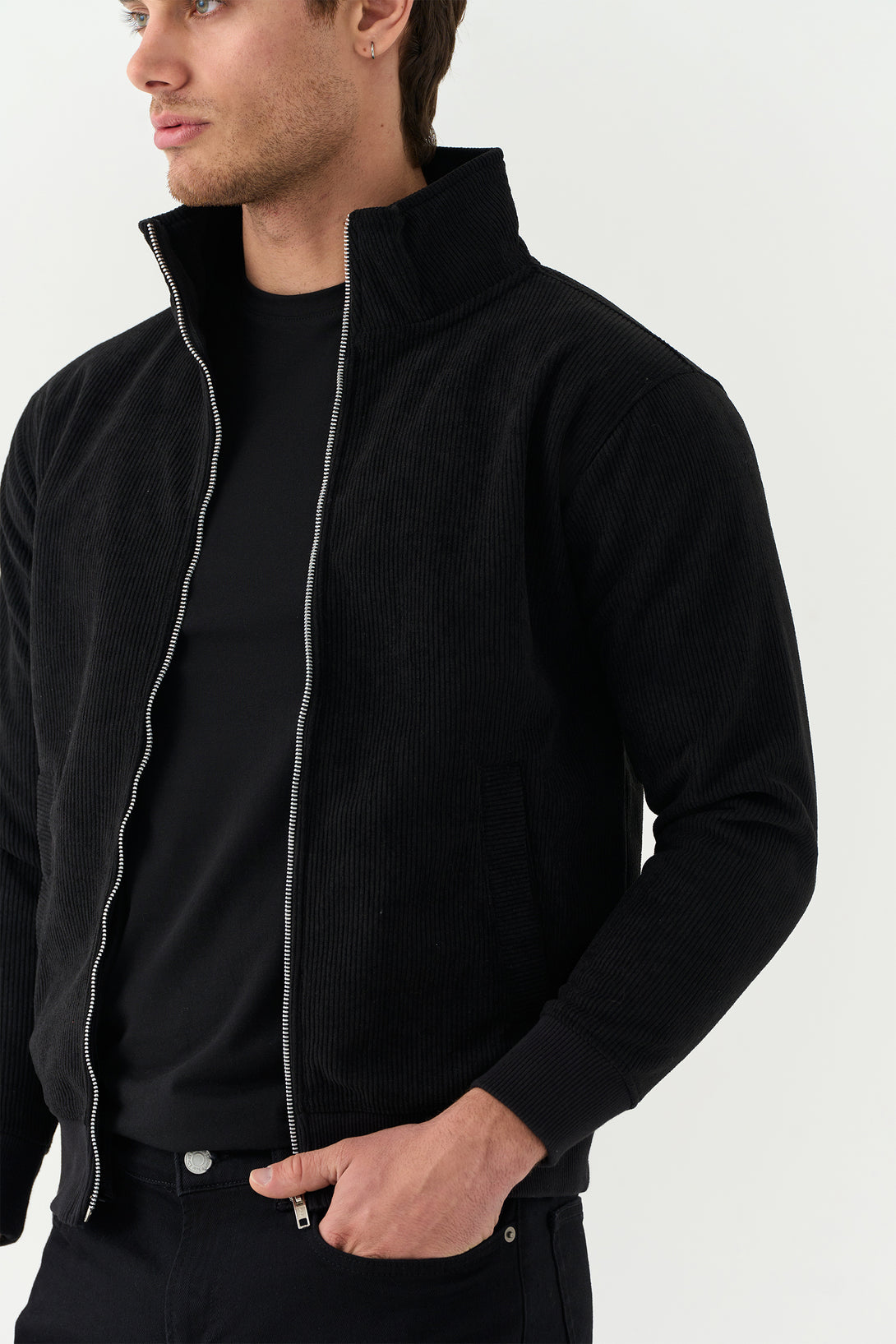 The Black Wide-Wale Corduroy Zipper jacket brings modern polish to classic corduroy. Designed with a sleek silhouette and smooth zipper finish, it’s a go-to layer for both comfort and confidence.