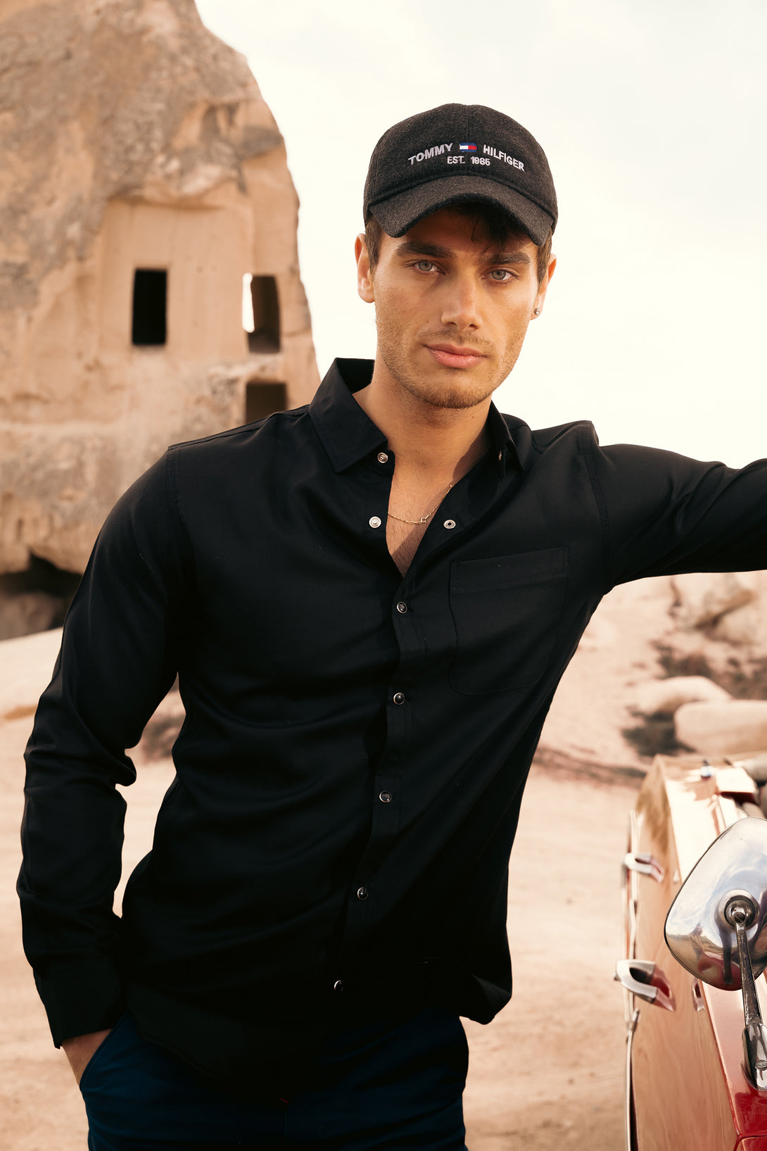 Modern snap-button detailing meets breathable fabric, making this black shirt perfect for tropical and relaxed wear.