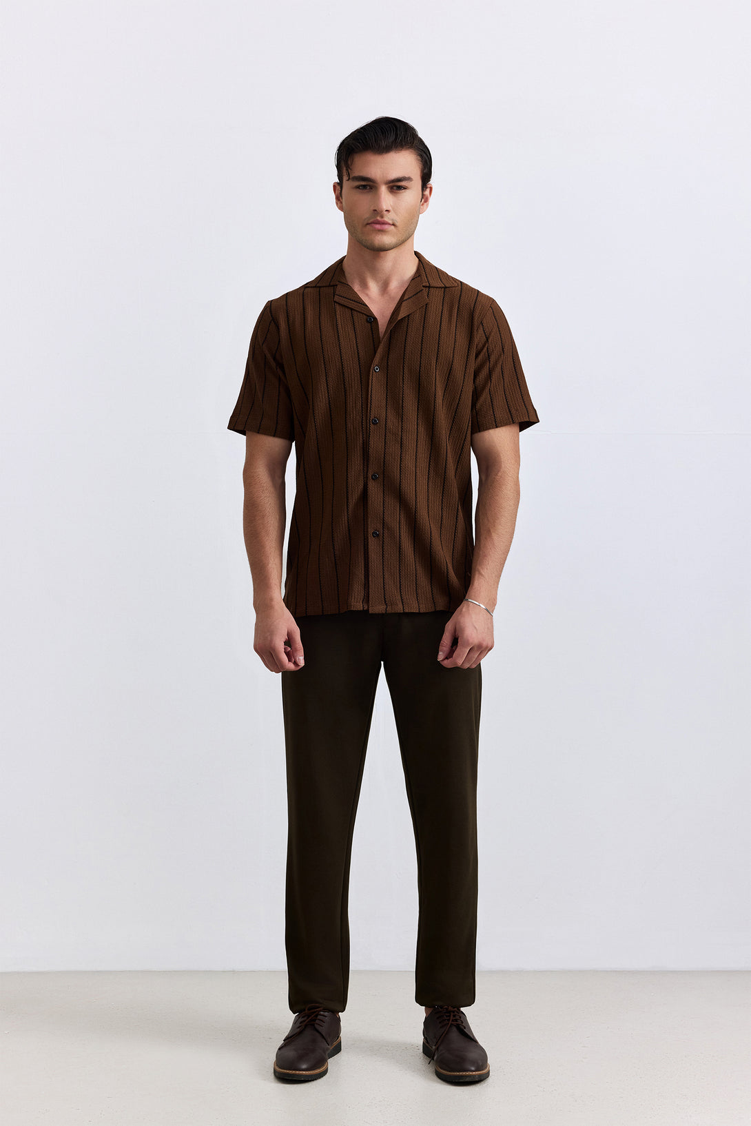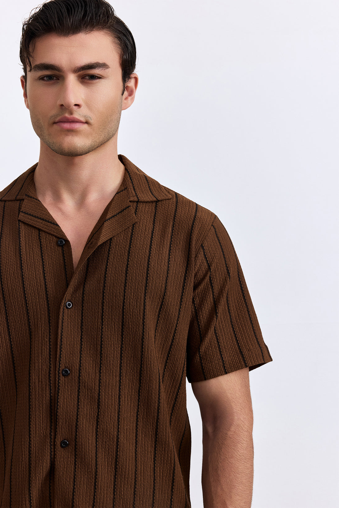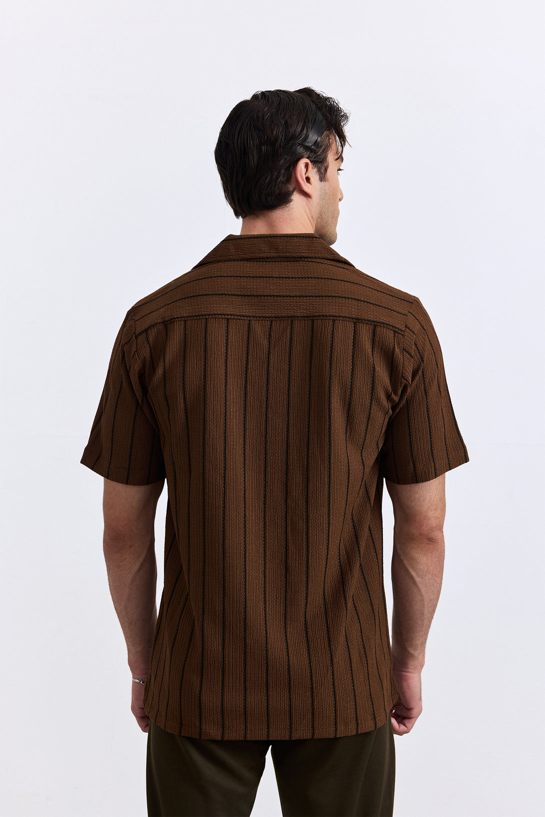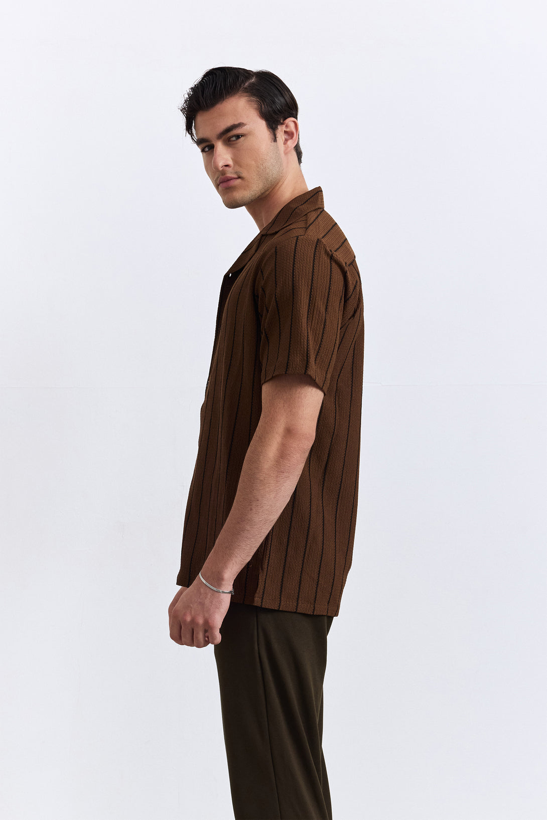Rich in tone and easy in wear, this chocolate camp collar shirt is ideal for tropical days and a relaxed lifestyle.