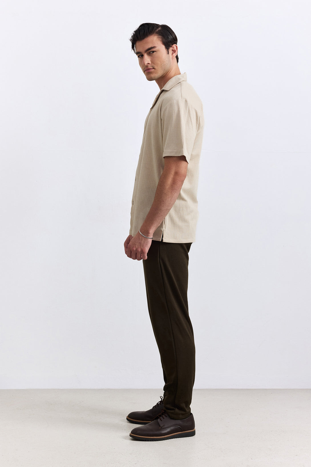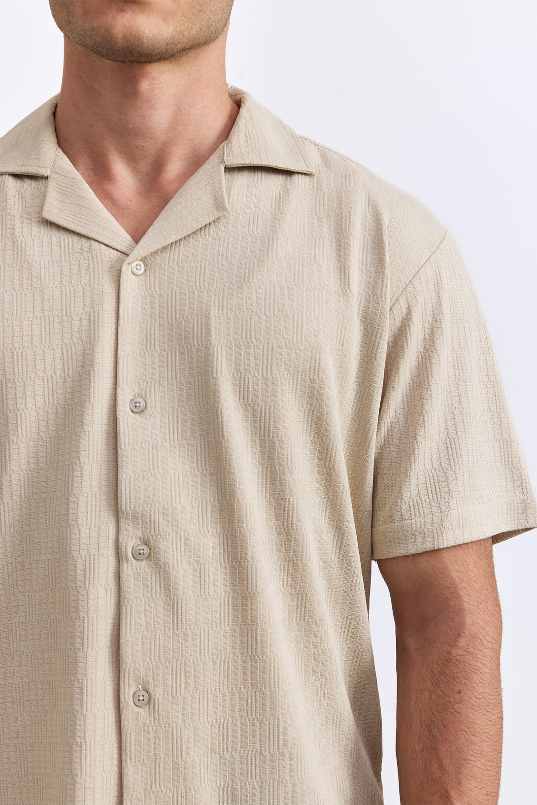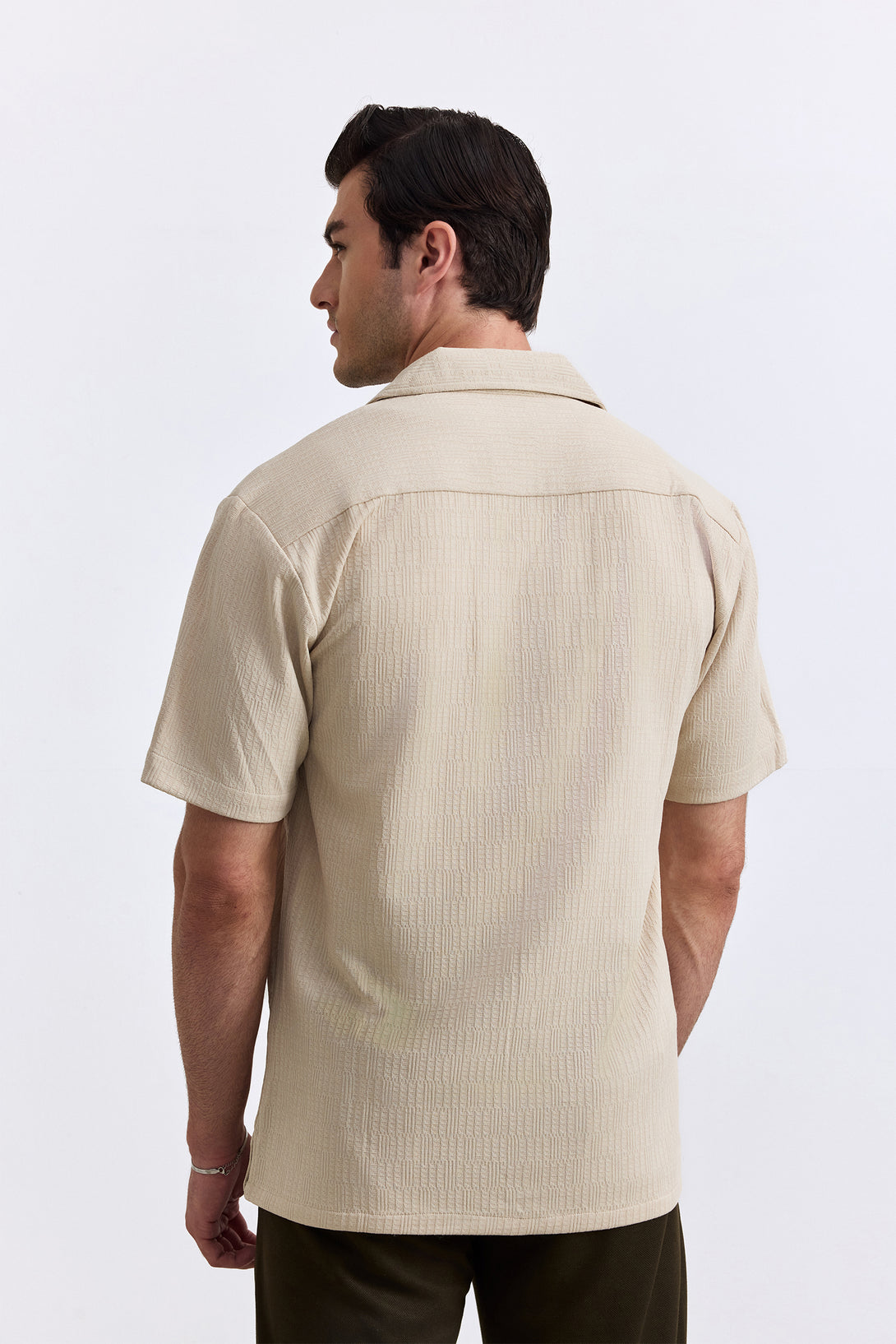 Relaxed and breathable, this beige camp collar shirt offers tropical comfort with easy-going style.
